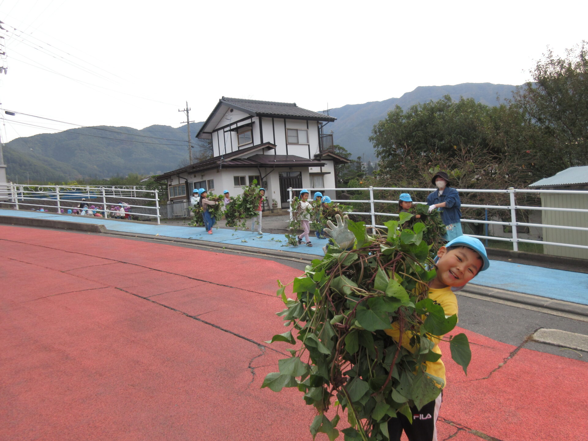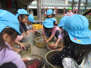 先日、やきいも大会が行われました!年長児、年中児で育てたサツマイモ。 収穫したサツマイモはとーっても大きくて重い!子ども達も一つ持つのに一苦労でした。そんな大きな芋を畑と園を何度も往復し一生懸命運びました。