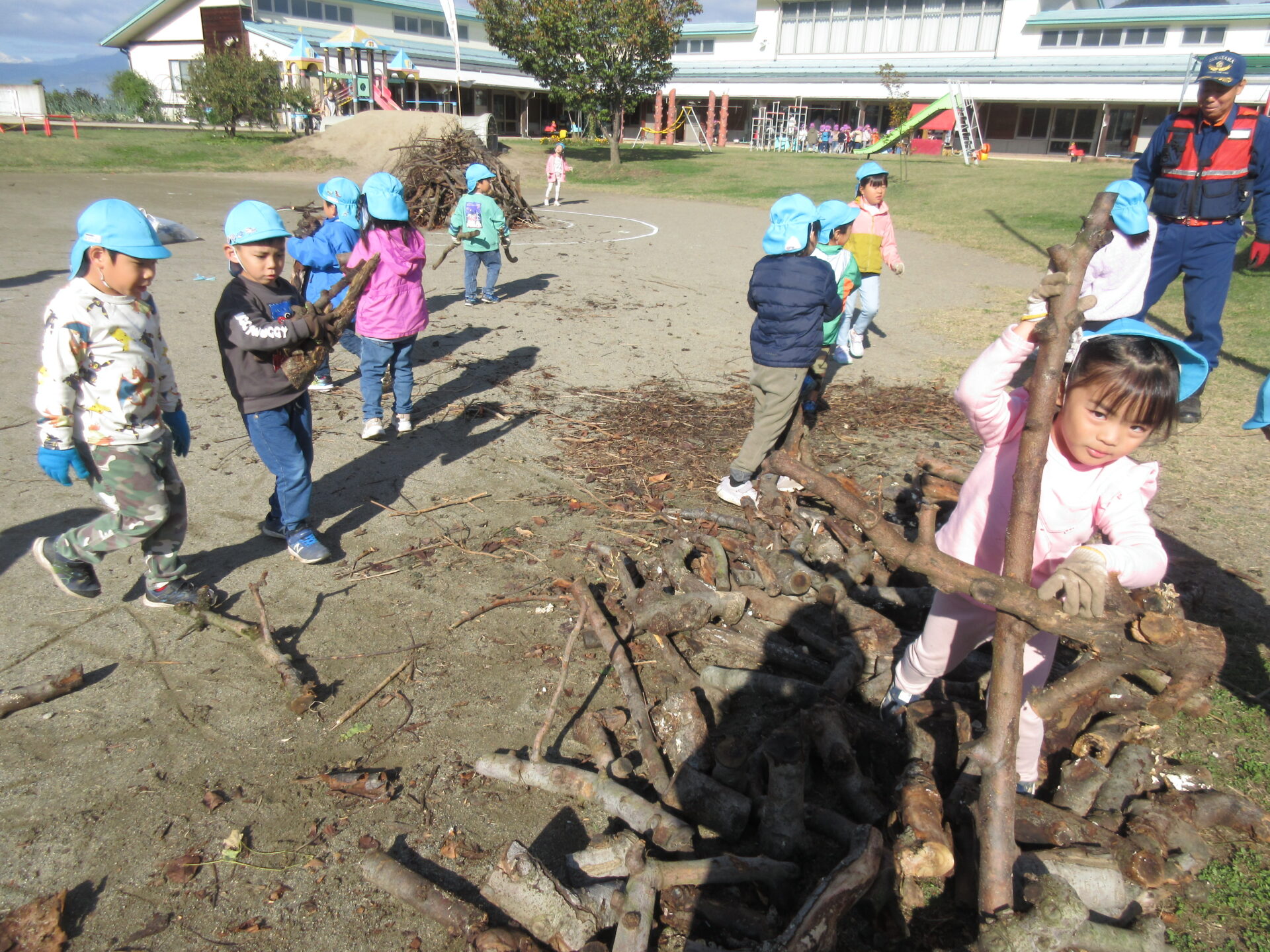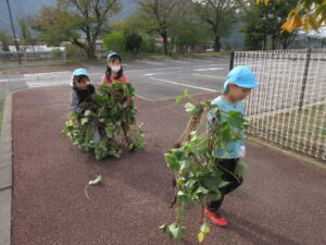 やきいも大会では一緒に楽しみ隊のおじいちゃん、おばあちゃん・消防団・消防署の方が応援に駆けつけてくれました。また、園にはやきいものスペシャリストの先生がいらっしゃるためその先生も関わってくださいました。 まずは燠を作るために木を集めます。力自慢の年長さんが手伝ってくれました。「この木重いよ。誰か手伝って!」と声を出しながら仲間と協力します。