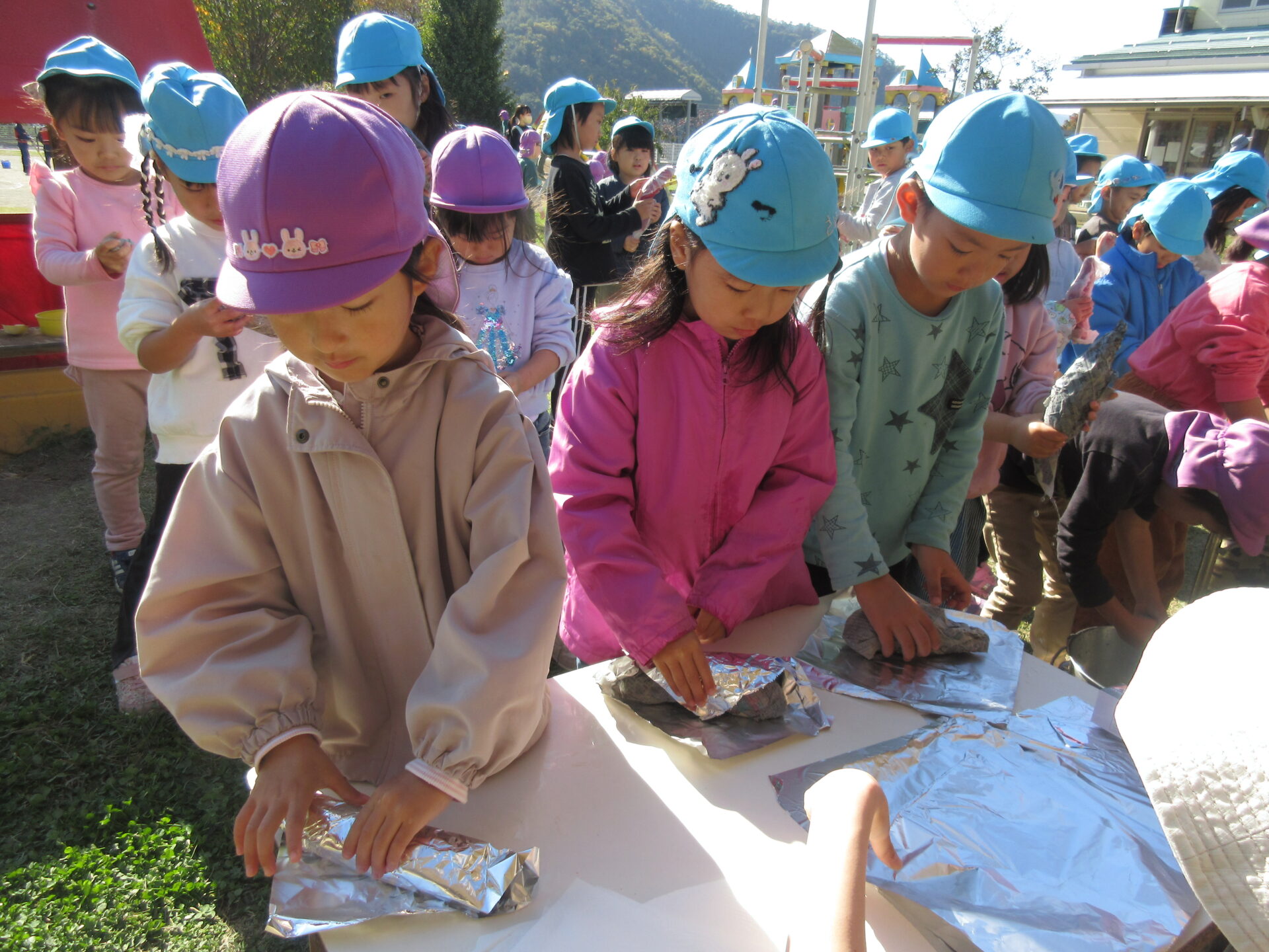 その後が火を付けて燠になるのを待ちます。その間にサツマイモを包みます。 まずはキッチンで包み、一度水につけます。その後、新聞紙に包みもう一度水につけます。最後にアルミホイルで包み完成です!楽しくって何個も何個も「やりたーい!」 燠になったらサツマイモを入れて「おいしくなーれ!」と魔法をかけます。