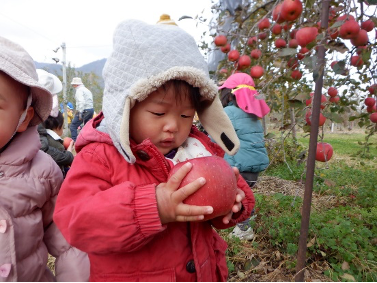 「あ、真っ赤なリンゴ!」 自分で収穫したリンゴを大事そうに見つめる姿がありました。 お家に持って帰ろうね♪