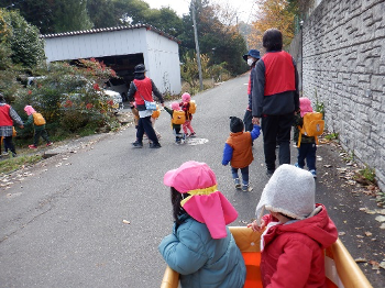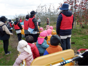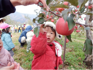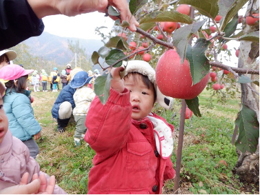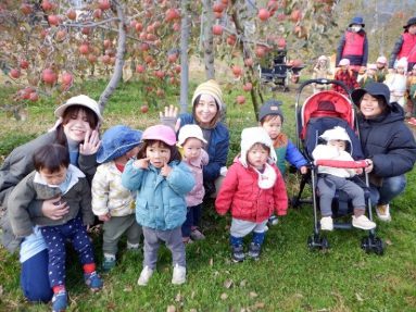 散歩に出かけると沢山のリンゴ畑や梨畑が広がっています。この小倉ならではの自然や環境を、五感を通して子どもたちが感じていっているのだと改めて感じたリンゴ狩りでした。 近隣の方にも温かく接していただき、一緒に過ごす時間を通して、子どもたちの健やかな成長につながっているのだと思いました。 今後も、散歩や戸外遊びをたくさん楽しみ、四季折々の自然に触れていきたいと思います。