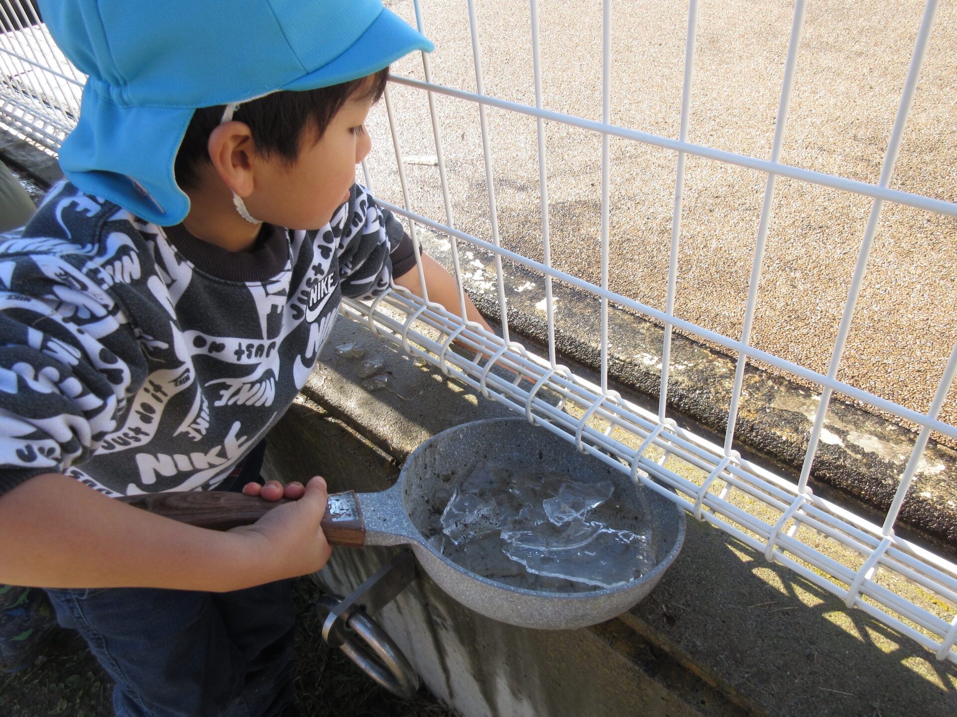 ある日いつも通りに外へ遊びに行くと、「見て!みて!」とあるものを発見した子ども達。あるものとは、氷でした!