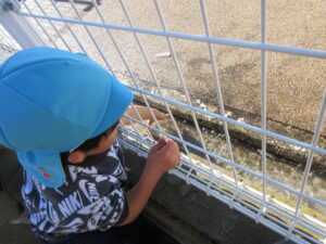 小さい手をフェンスの隙間に入れて「あともうちょっとだ!取れた~」
