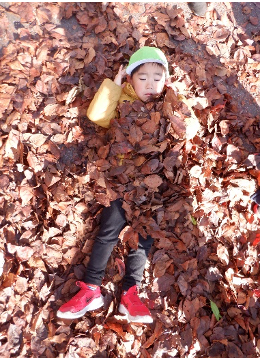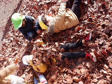 「もっとはっぱかけて!顔はチクチクするからかけちゃだめだよ。」