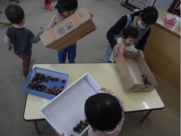 たくさん集めたどんぐりを園に持ち帰り、お部屋で遊びました♪
