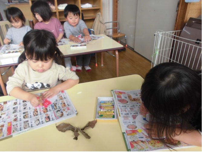 11月の製作では、折り紙でどんぐりを作り、帽子をクレヨンで塗りました。