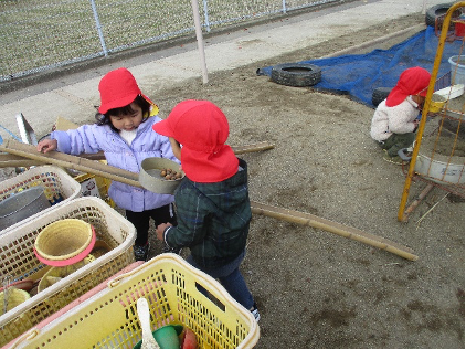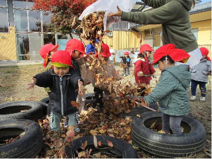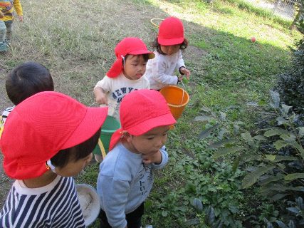 ・どんぐりや姫りんごなどを手にしたり砂場遊びでままごとに使ったりしていた。保育士が転がす遊び方を見せた。するとコロコロと転がっていく様子を楽しんで見ていた。「どんぐりコロコロだね」と子どもの思いを一緒に共有することで、繰り返し夢中で遊んでいた。