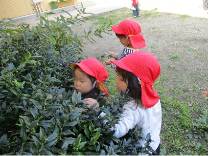・マサキは普段遊んでいる庭に植えられていている。最初に保育士が実を採って手の平に乗せて見せたことで、子どもが興味を示すようになった。子どもの中に好奇心が芽生え“自分で採ってみよう”という姿が見られた。その中で採れないと訴えていた子もいたが、保育士に採ってもらったり、友達が採ろうとする様子を見て真似したりする姿があった。自然への興味が出てくるようになった。