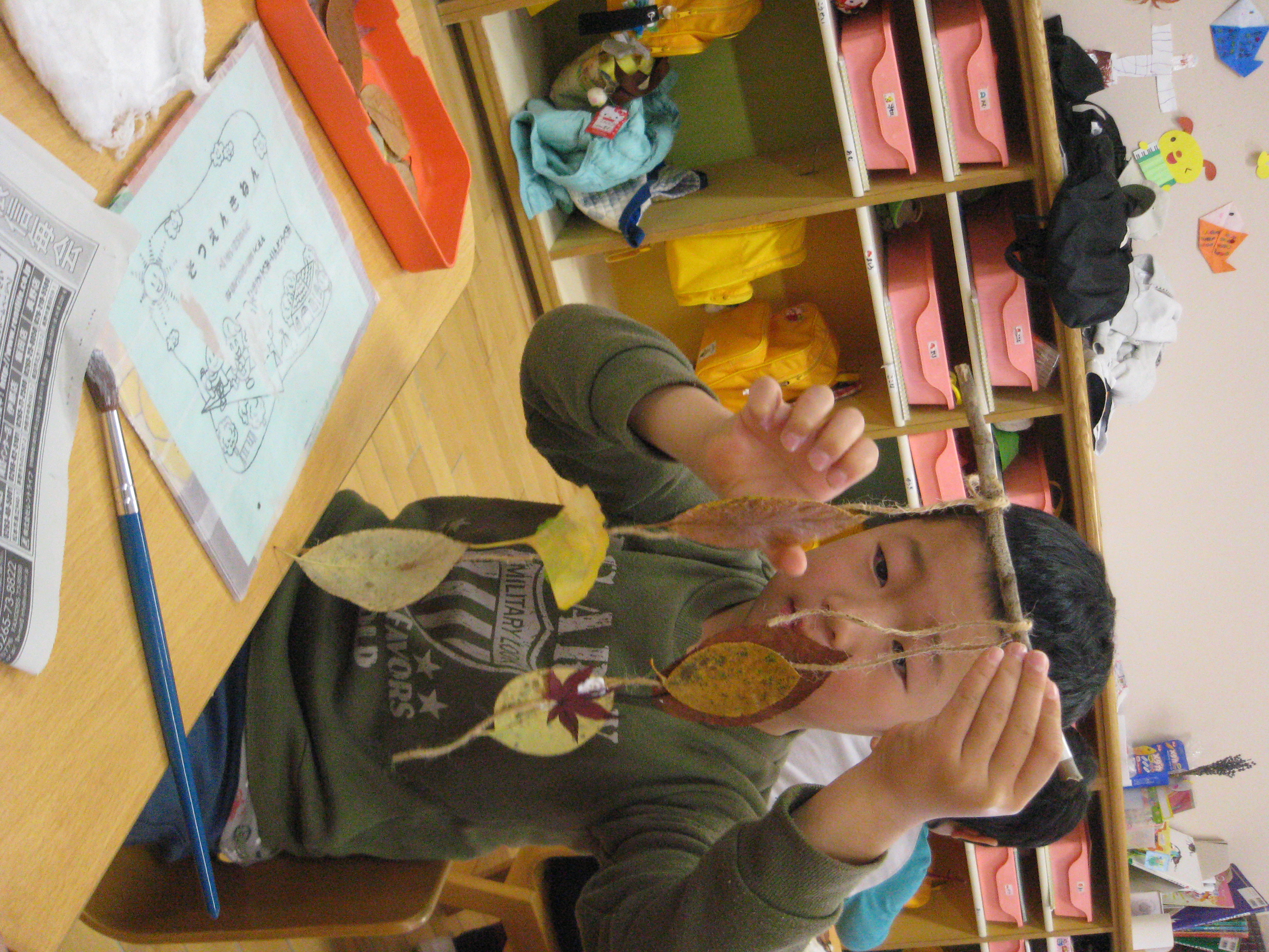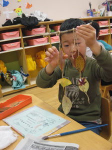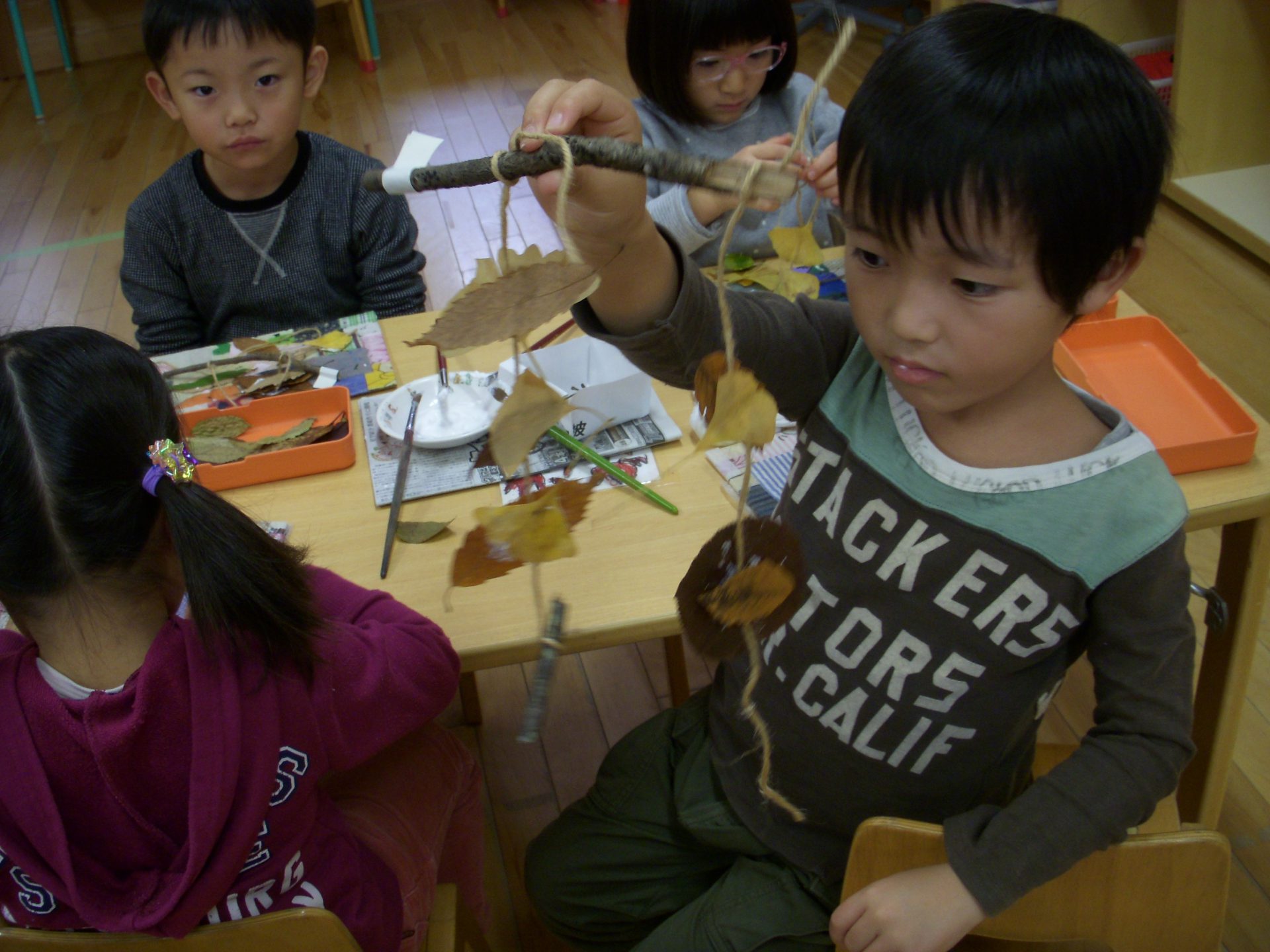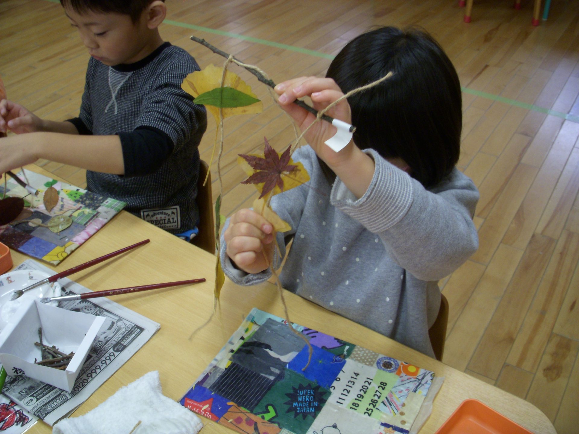 自分達で集めてきた落ち葉や小枝を使いモビールを作ります。赤、黄、茶、オレンジの色を楽しみながら、「どんな組み合わせにしようかな?」と願いを持って作ります。
