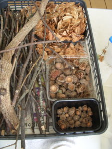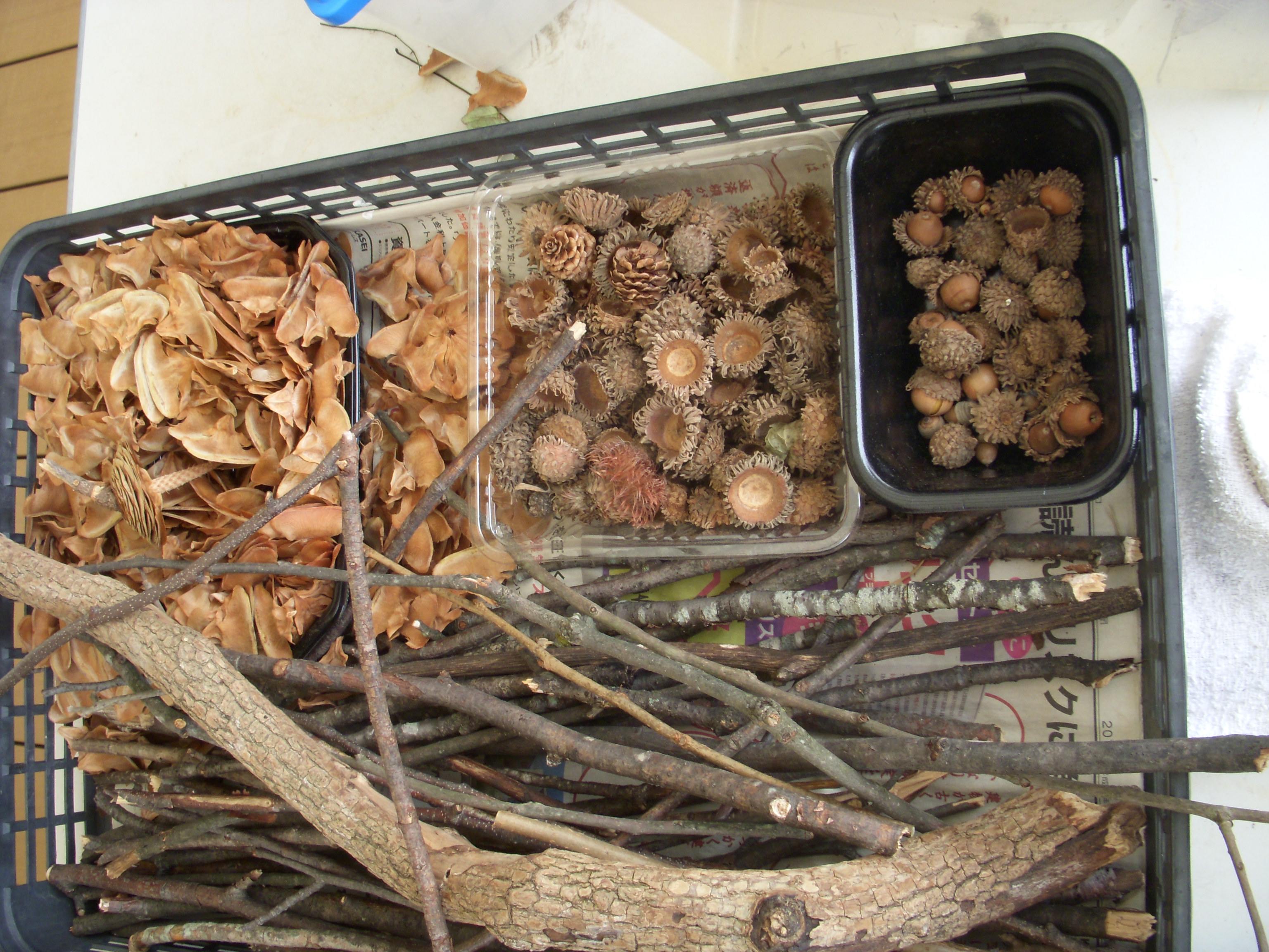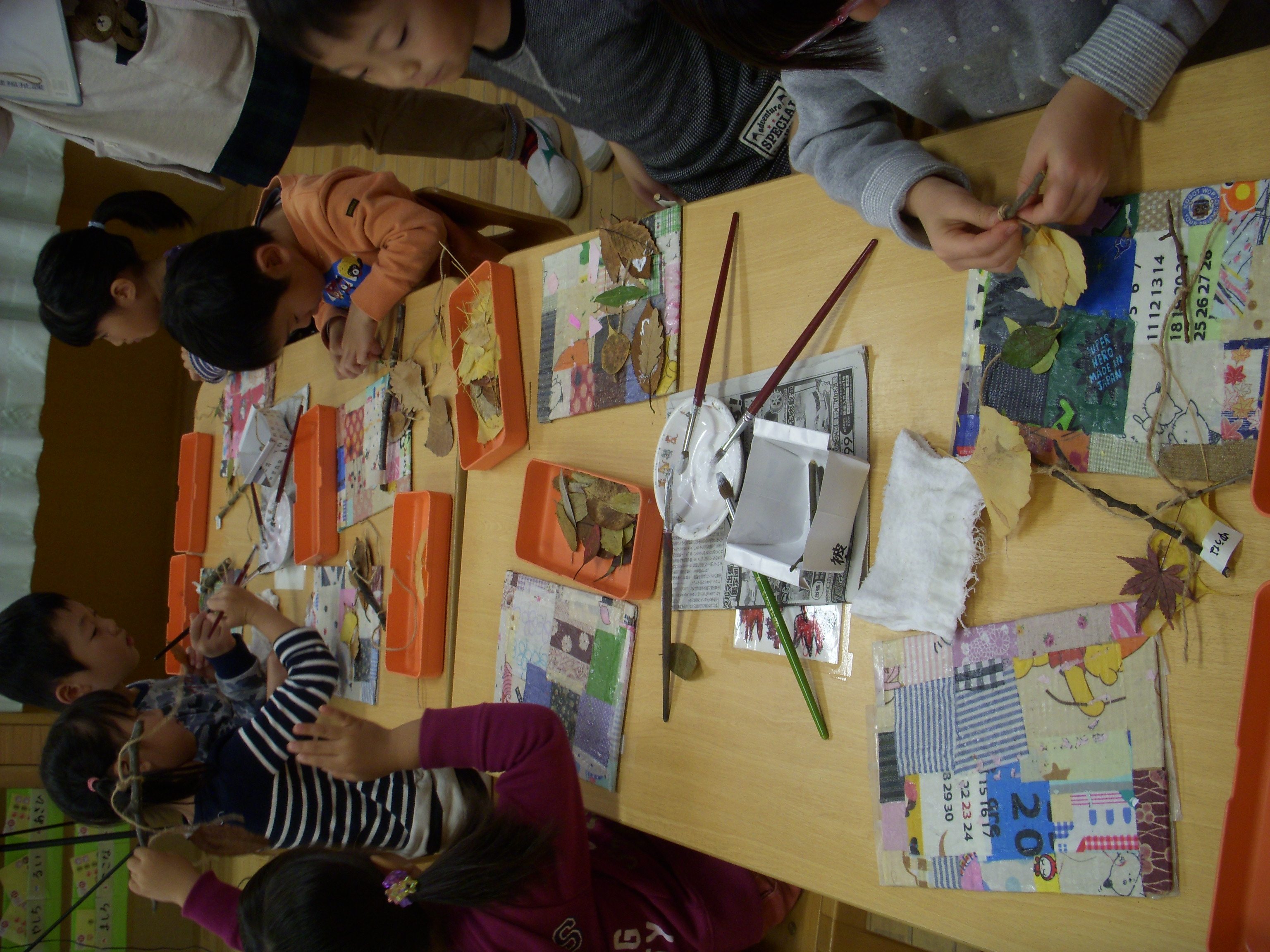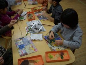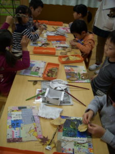 豊かな自然に恵まれた当園、この時期は多種多様な秋の自然物がたくさん拾えます。それらをふんだんに使い制作をします。