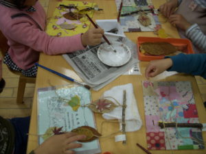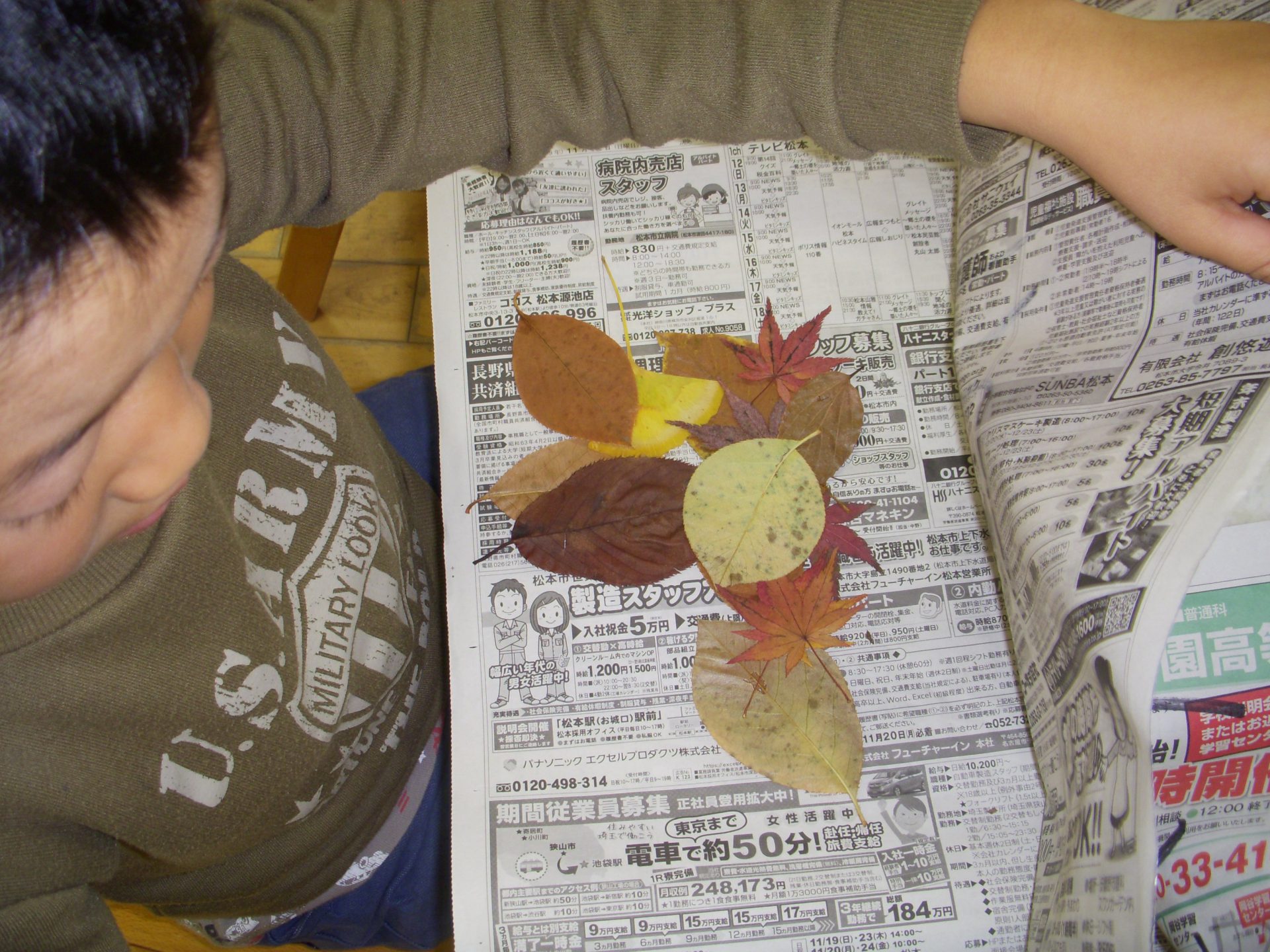 前日に落葉を拾いに穂高荘へ出かけました。拾った落葉を新聞紙で押葉にしたので、きれいな形の落葉になりました。色彩豊かな落葉を見て「あー、きれい。」と言う声が聞かれました。常に自然と関わってきた子ども達だから出た言葉だと思います。