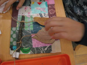 麻紐を落ち葉で挟みます。「1、2、3、4、・・・10まで数えると葉っぱがくっつくんだよ。」と自分達で工夫しています。