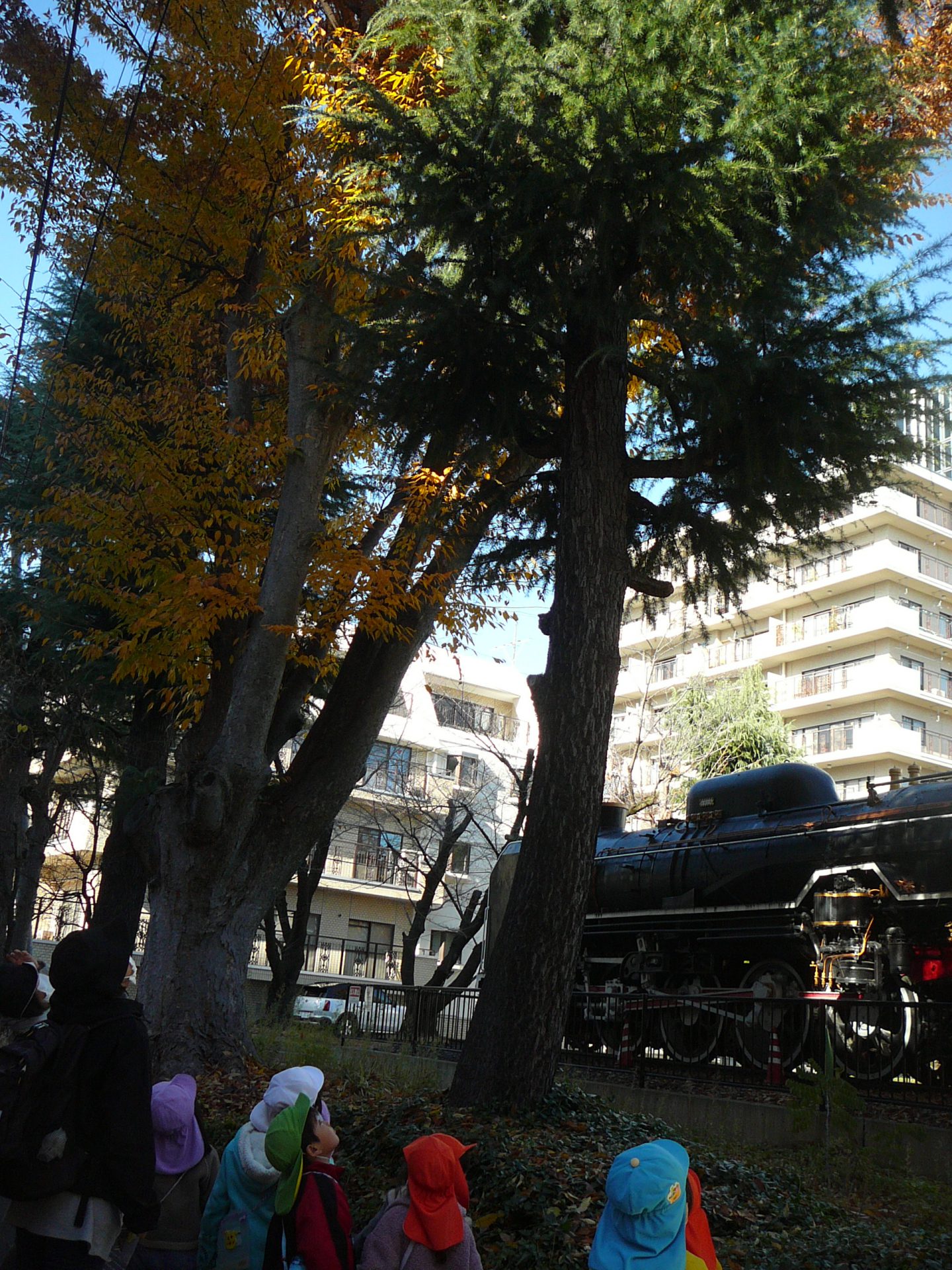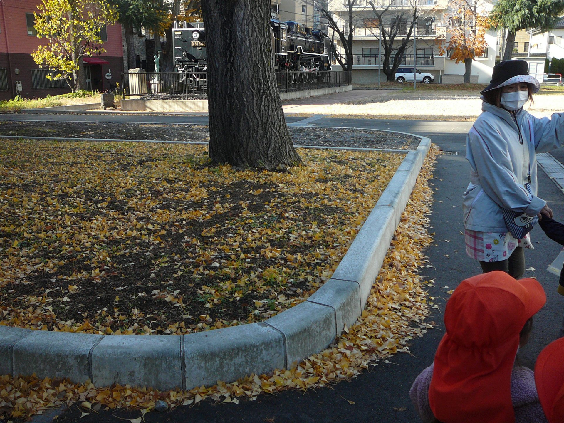 SL広場に行くと「葉っぱ、いっぱい落ちてる!」黄色い落ち葉がたくさん。見上げると・・・