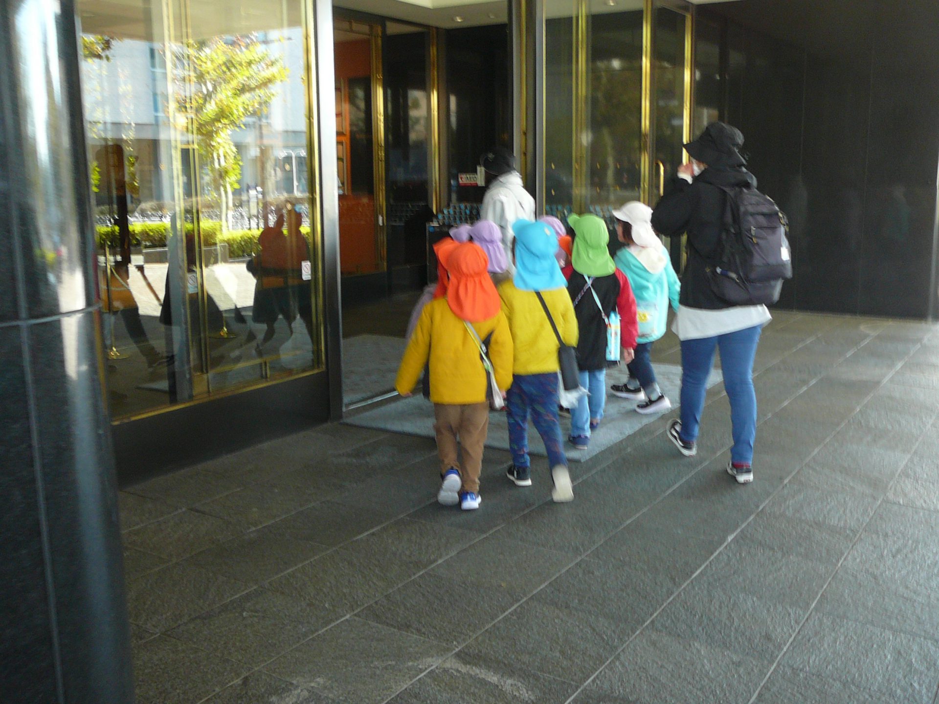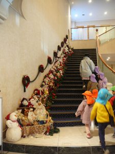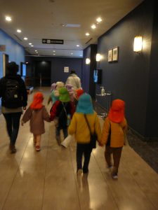 別のホテルの飾りも見に行きました。ずらっと並んだサンタさんに「すごいー!」と目を丸くする子どもたちでした。