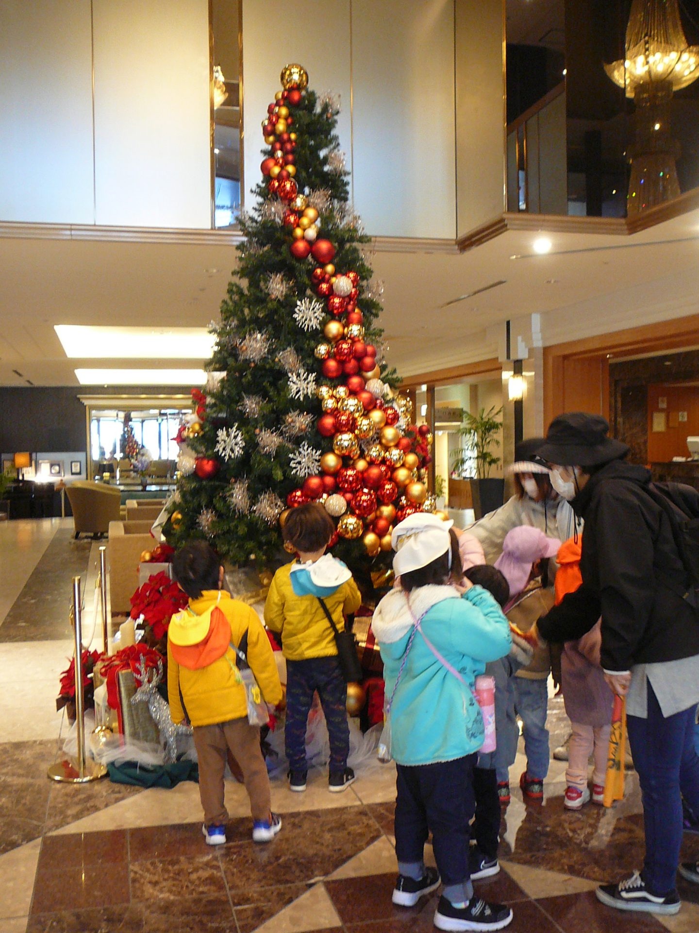 ロビーに大きなクリスマスツリーが!「すごいー!大きい!」子どもたちも大興奮です。さらに「うわー、上すごい・・」