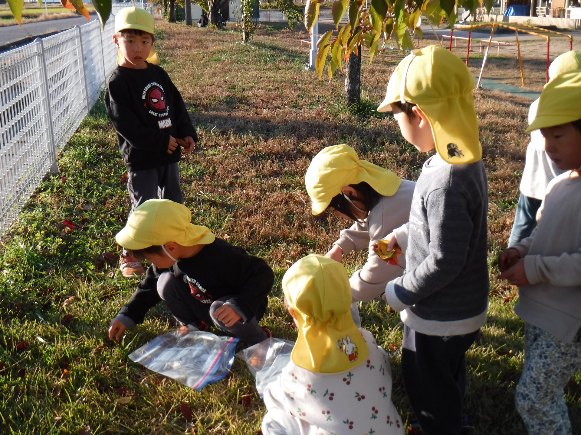 「これもきれいだよ」「手みたいなかたちしてる!」とカエデの葉をみつけ、友だちと拾い集めました。
