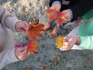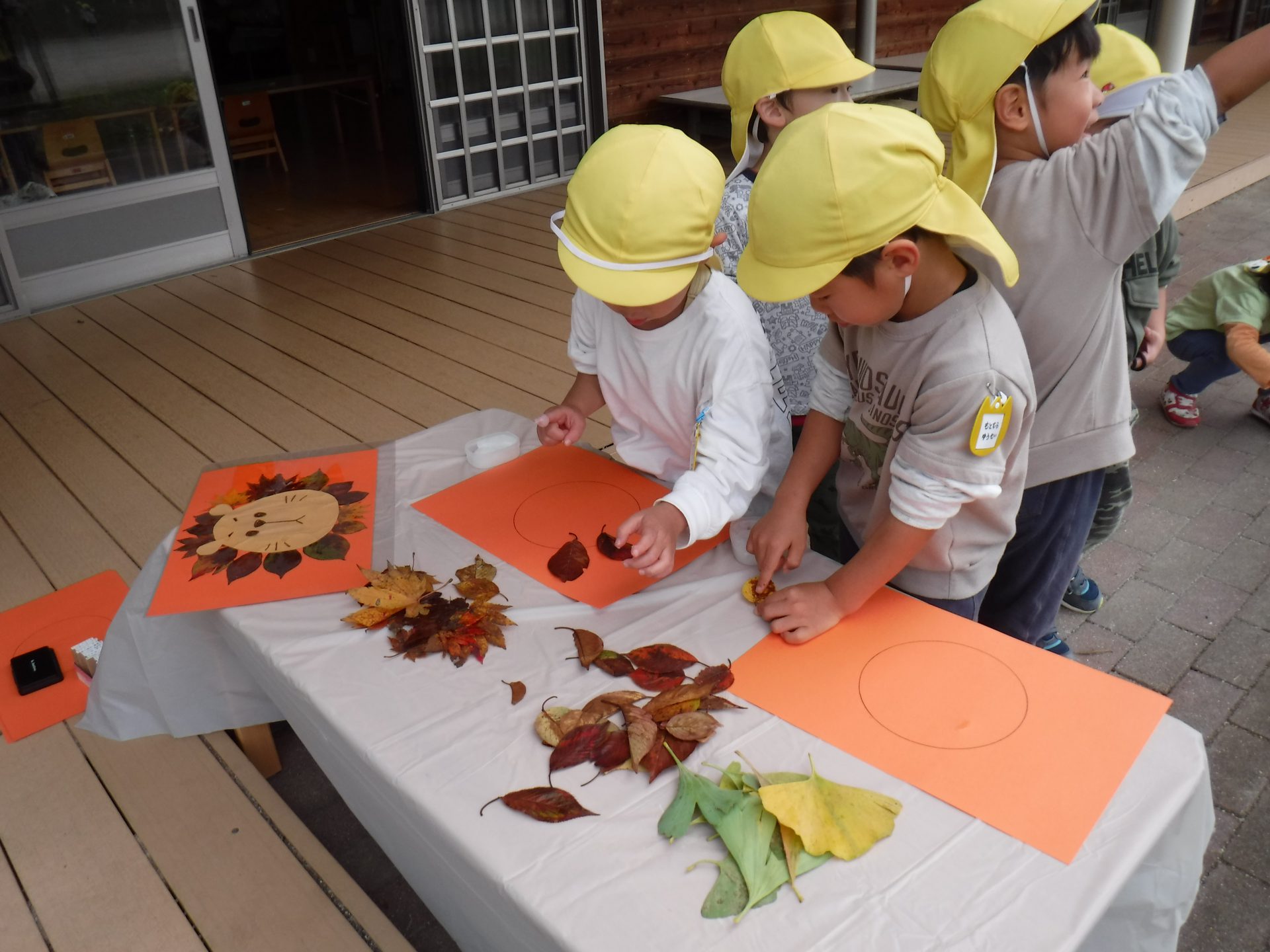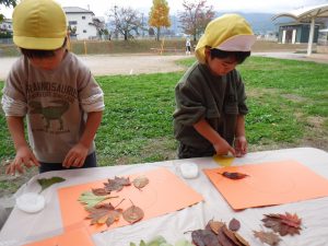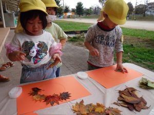 緑色だった葉っぱが秋になって様々な色に変わり、落ち葉にとなっていく様をみて、移りゆく季節の変化に触れ、関心をもった様子でした。