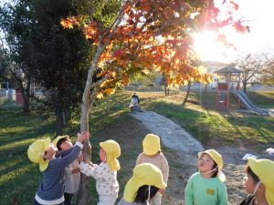 園庭の木々が次々と色づいた葉を落とし始めた晩秋。 赤、黄色、緑と3色になった桜の葉を見つけて、「にじいろのはっぱ!」と顔を見合わせる子どもたち。