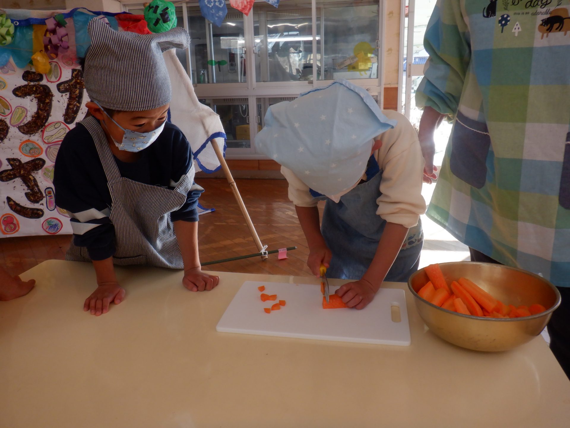 年長さんは包丁を使い、人参・サツマイモ・コンニャクを切りました。