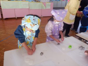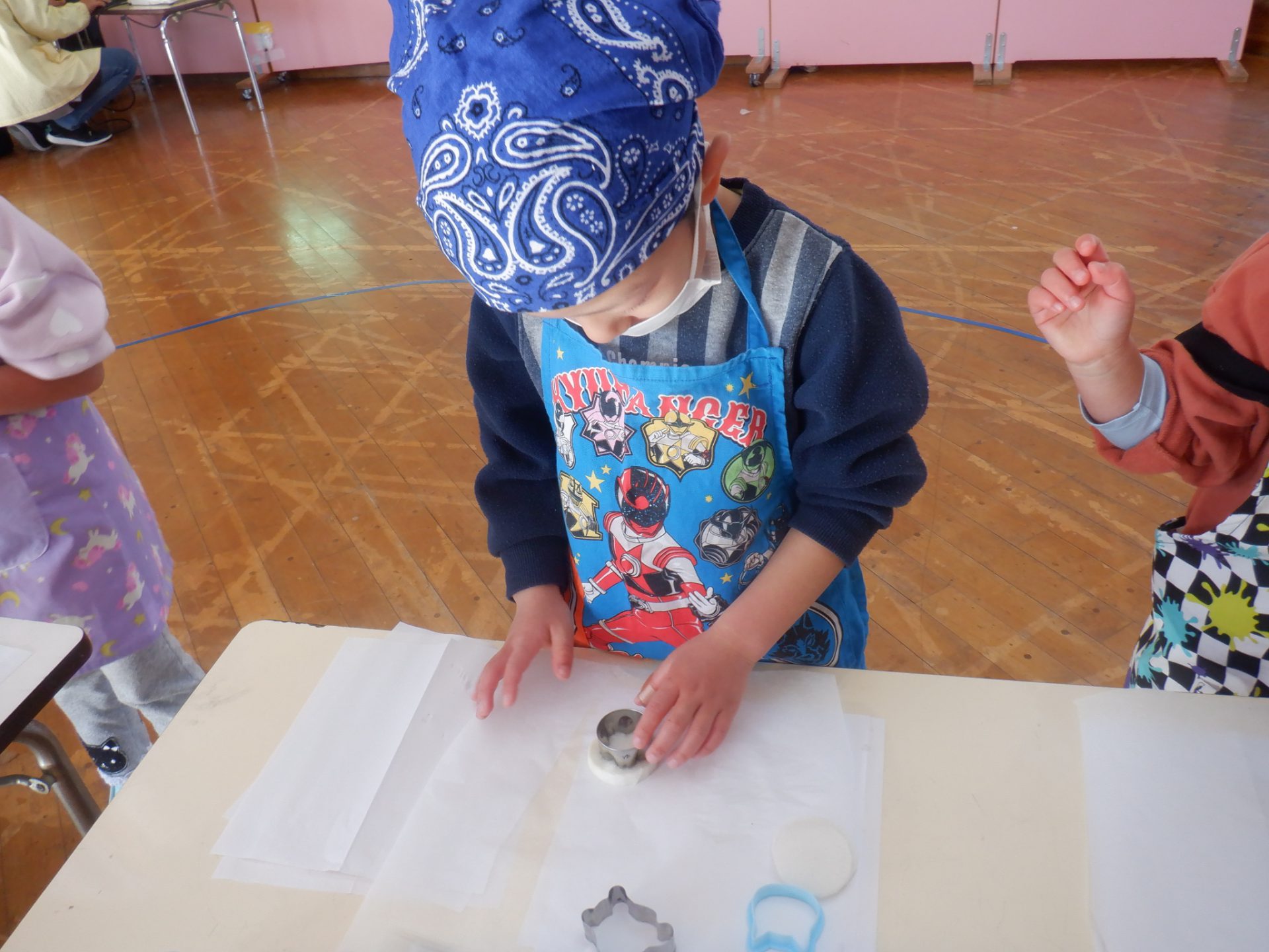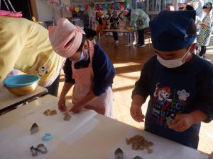年中さん・年少さんは型抜きを使って大根の型抜きをしました。ハートやお花、くま、ミッキーなどひとつ型が抜けるたびに嬉しそうに見せてくれました。