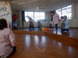 未満児さんは職員に抱っこされたり、おんぶされたりしながら、わらべ歌に合わせて虹の橋を渡ります。