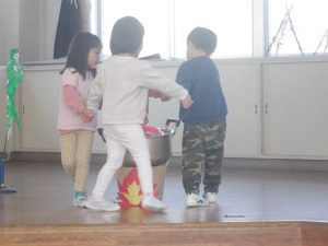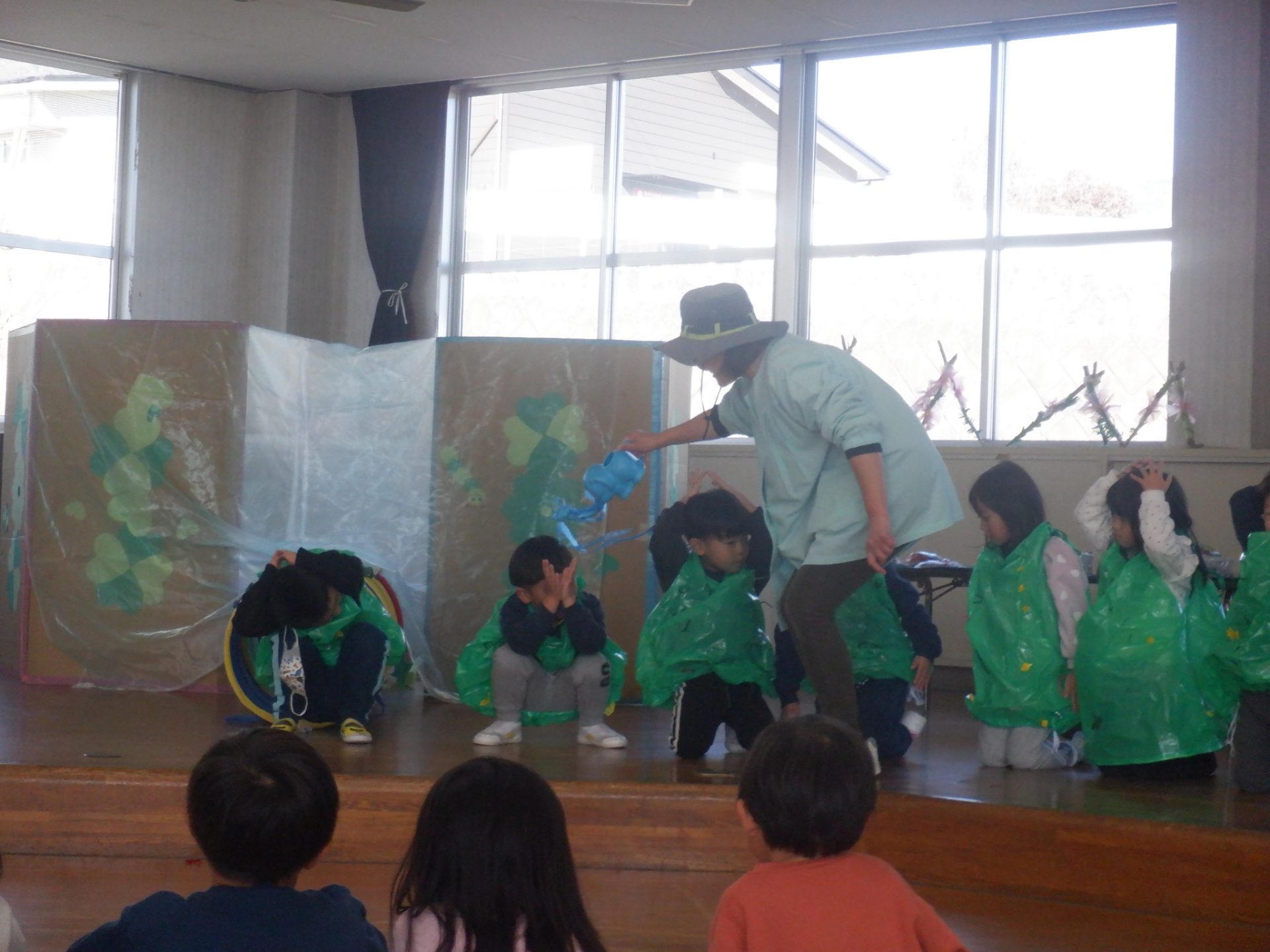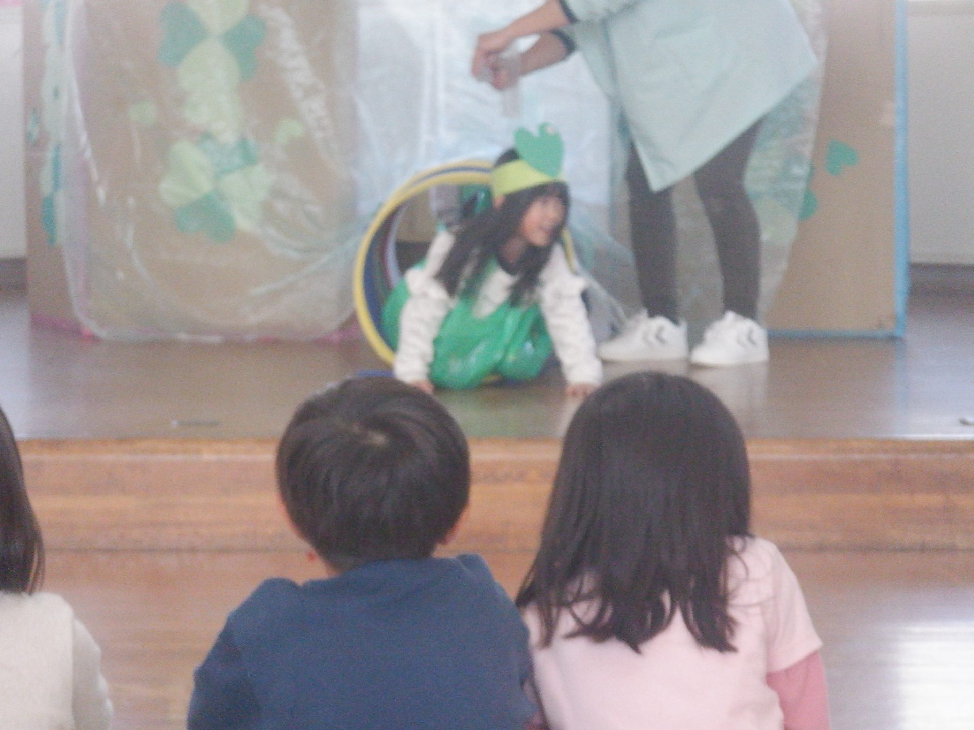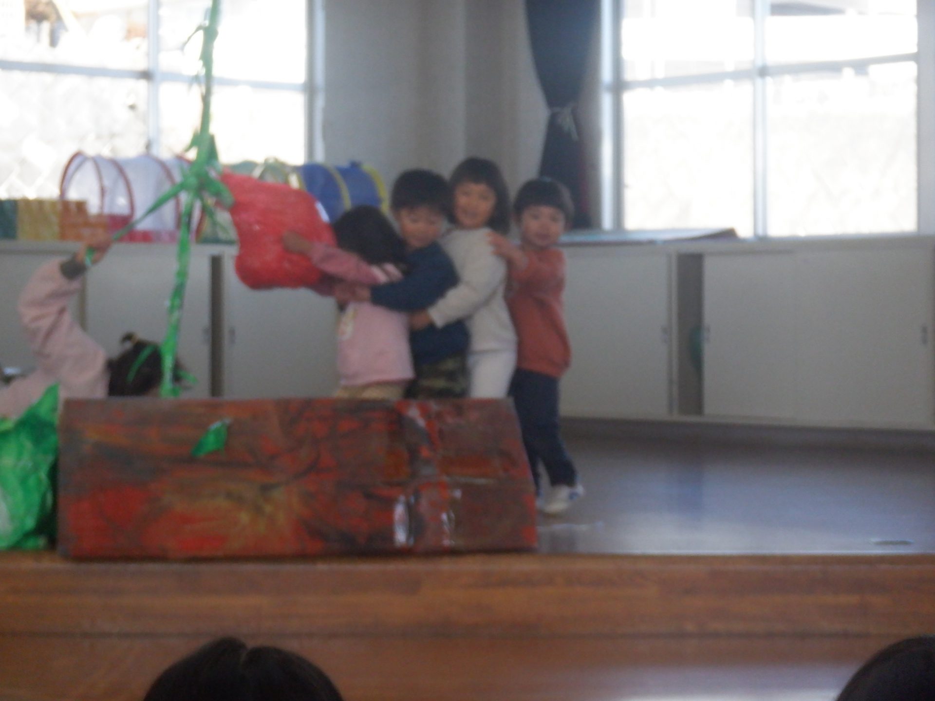 年少さんは自分たちで育てたトマトのことを表現しました。大きくなったトマトを皆で力を合わせて抜いたり、「トマトが苦手だからお料理にしよう」と“あぶくたった”の曲でトマトを煮てケチャップに・・・ハンバーグやスパゲッティなどのお料理も出てきました。