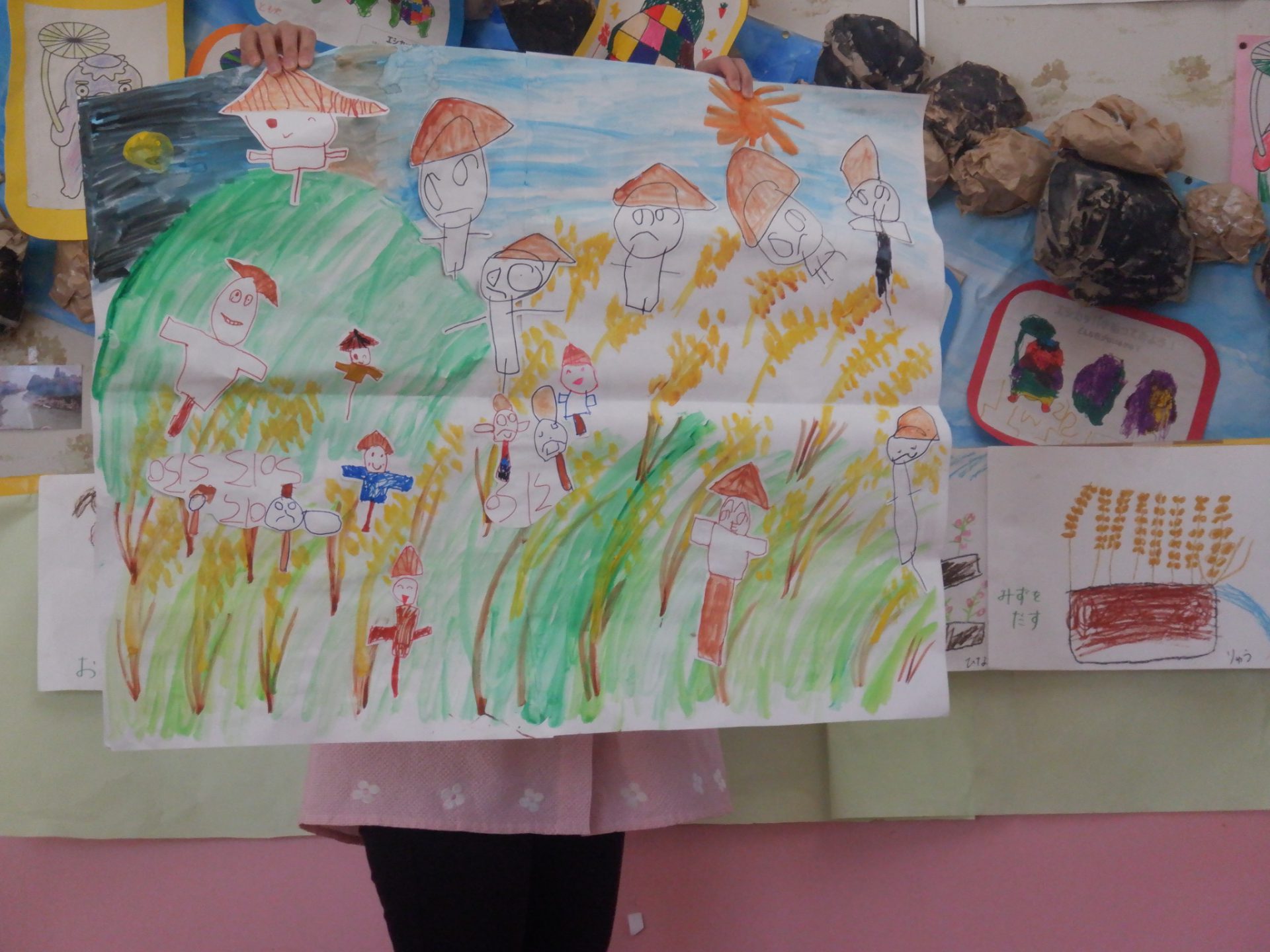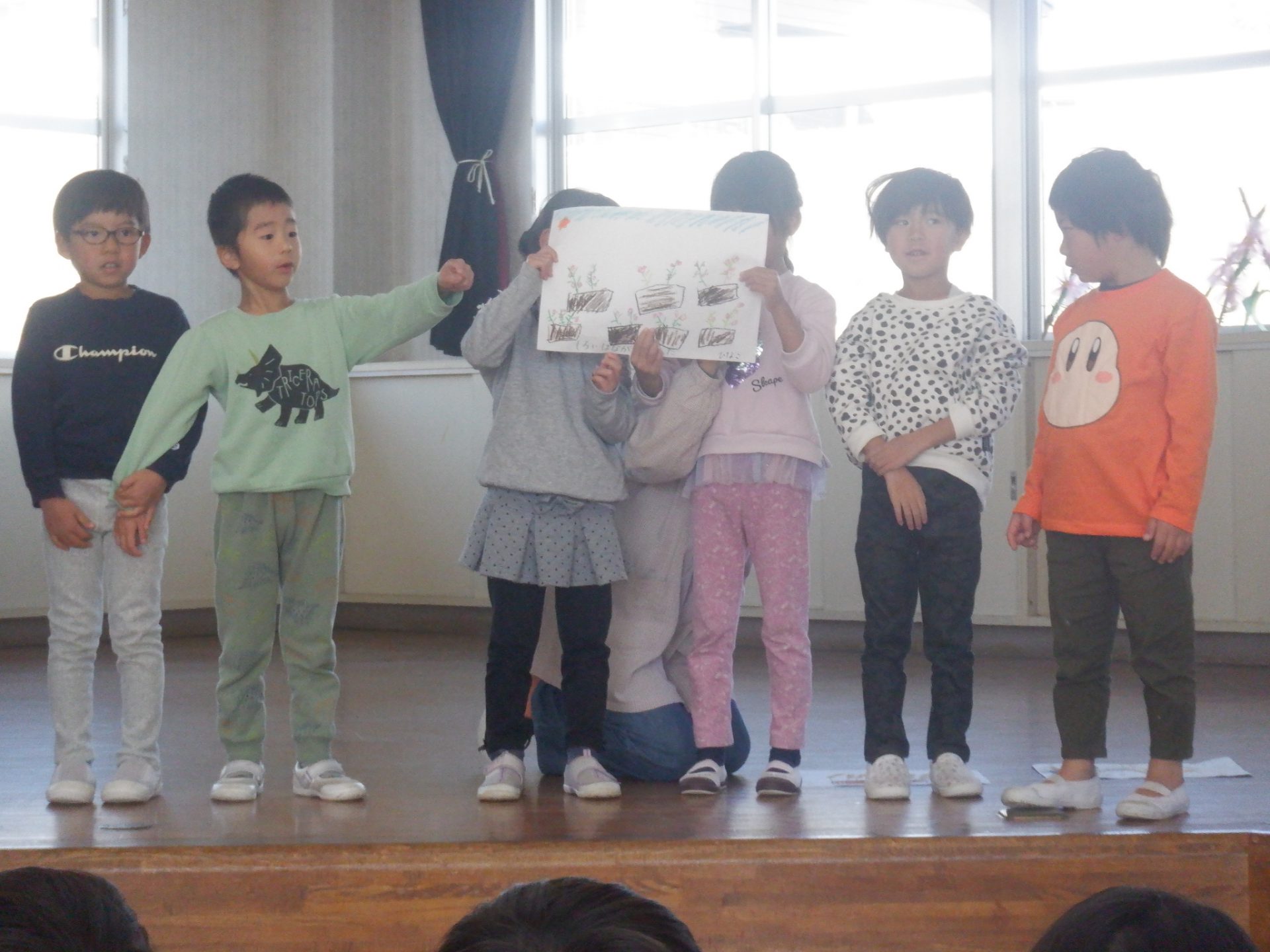 年長さんは一年間稲作に関わらせてもらったので、大変だったけど、楽しいこともいっぱいあったし、お米ができたことがうれしかったことを発表しました。