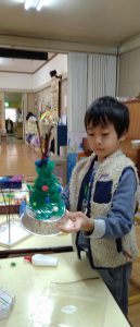 自分で選んだ長い松ぼっくりを使い、クリスマスツリー作り。