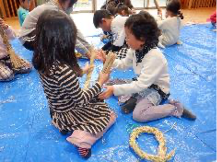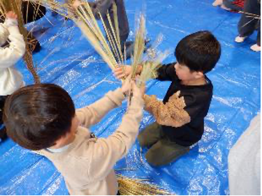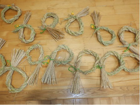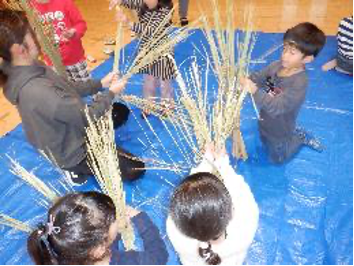 地域の方に準備していただいた材料を使って、しめ縄作りの始まりです。