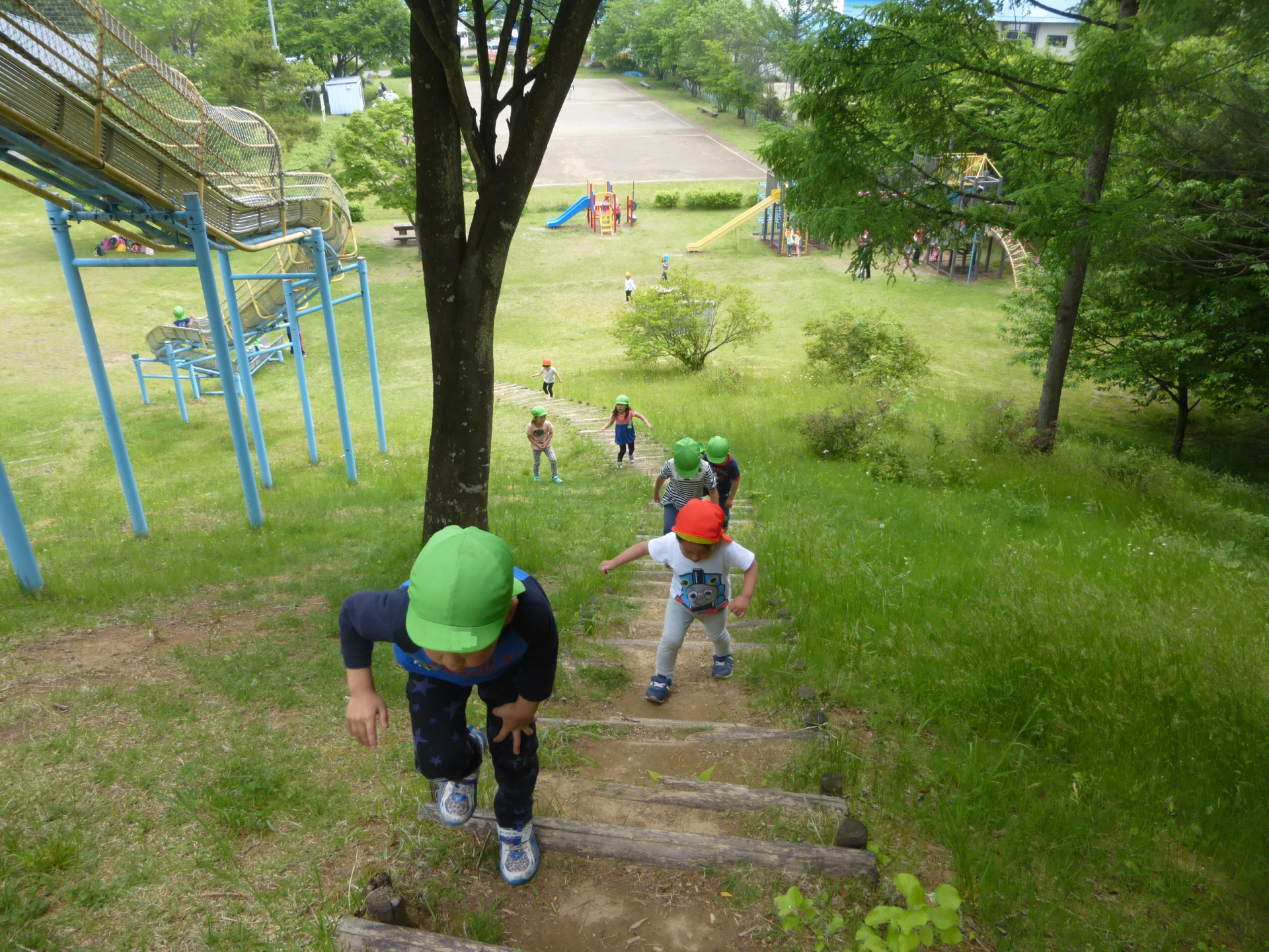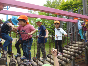 「グラグラするね・・・」と話しながら、お友達と吊り橋を渡り、冒険気分♪