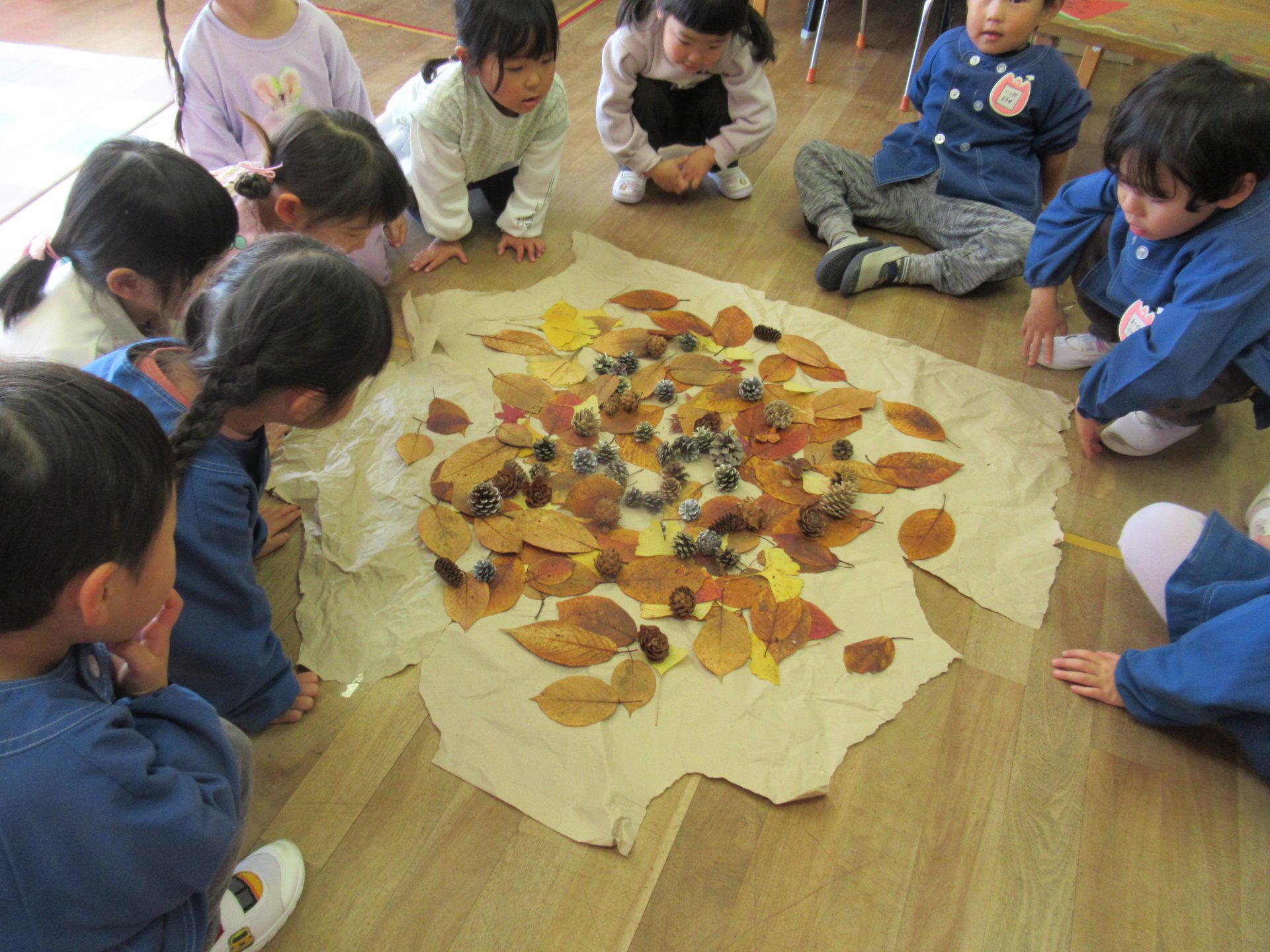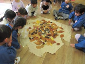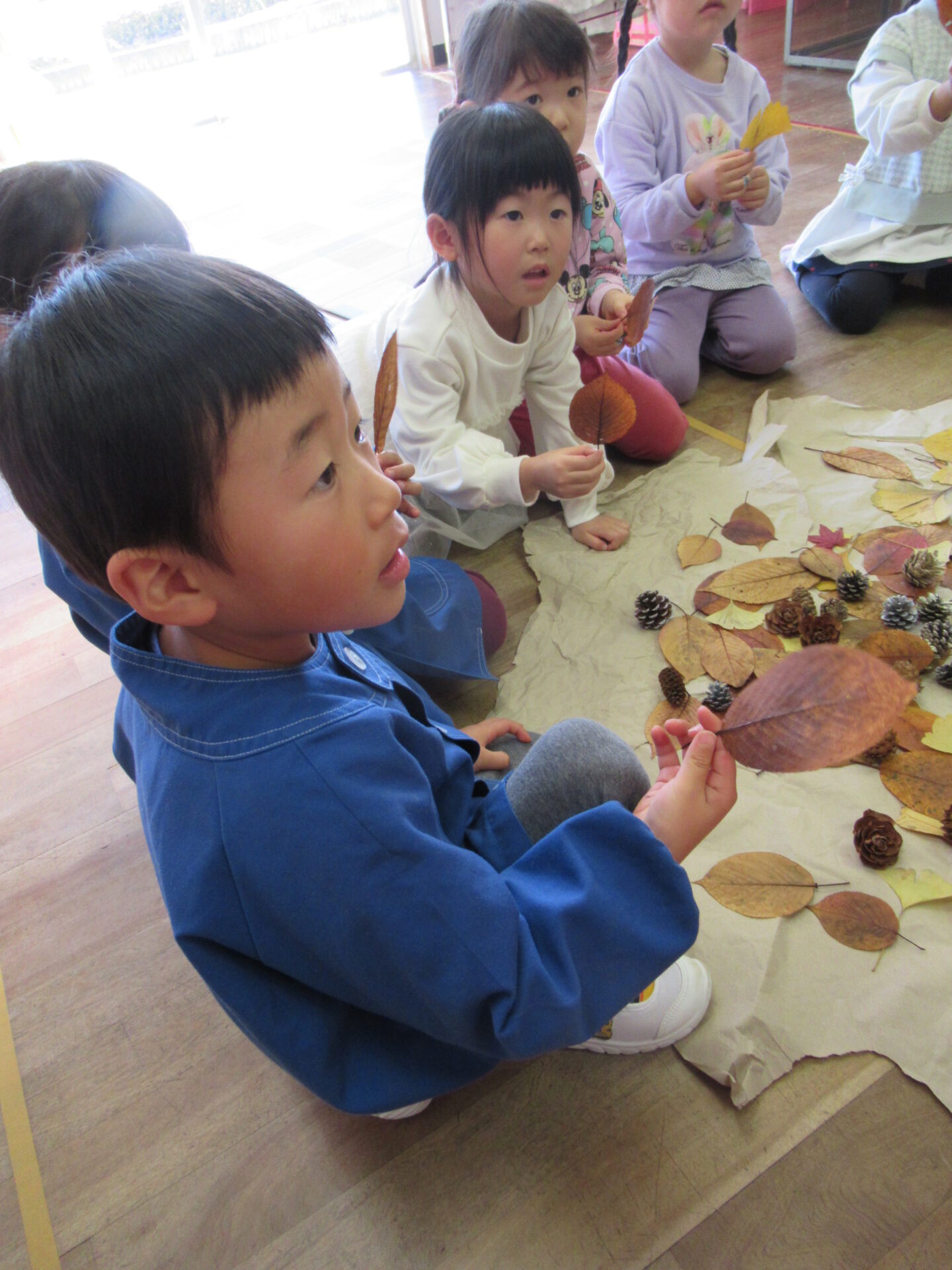 園庭にある木の葉っぱが風にふかれて沢山落ちていました。桜の葉っぱ、イチョウの葉っぱ、紅葉の葉っぱなどなど…