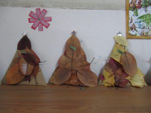 様々な種類の落ち葉を集め、押し葉にしたものでクリスマス製作をする