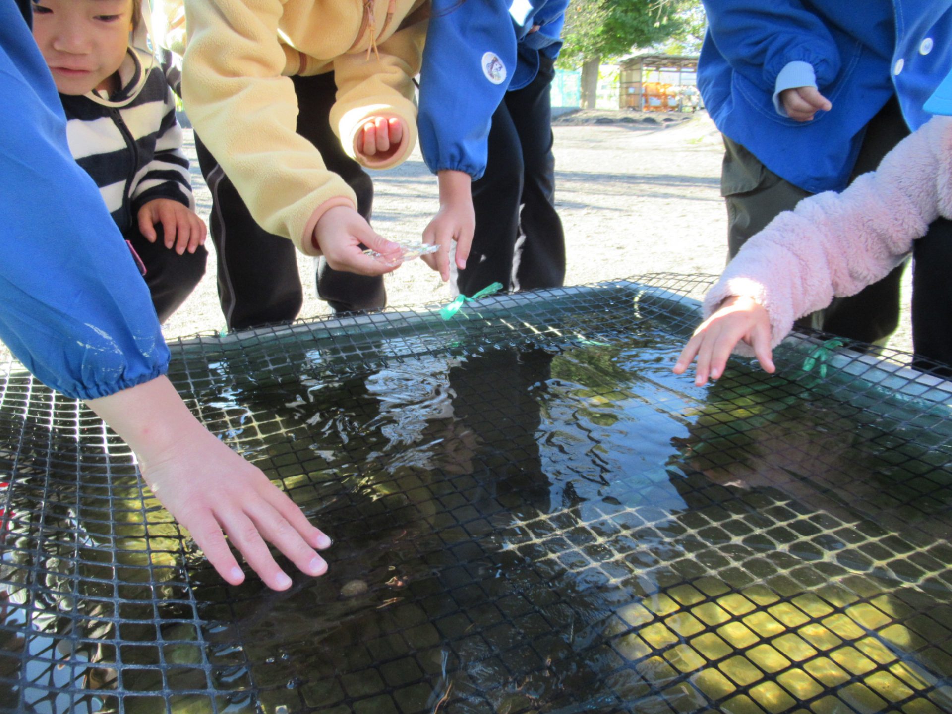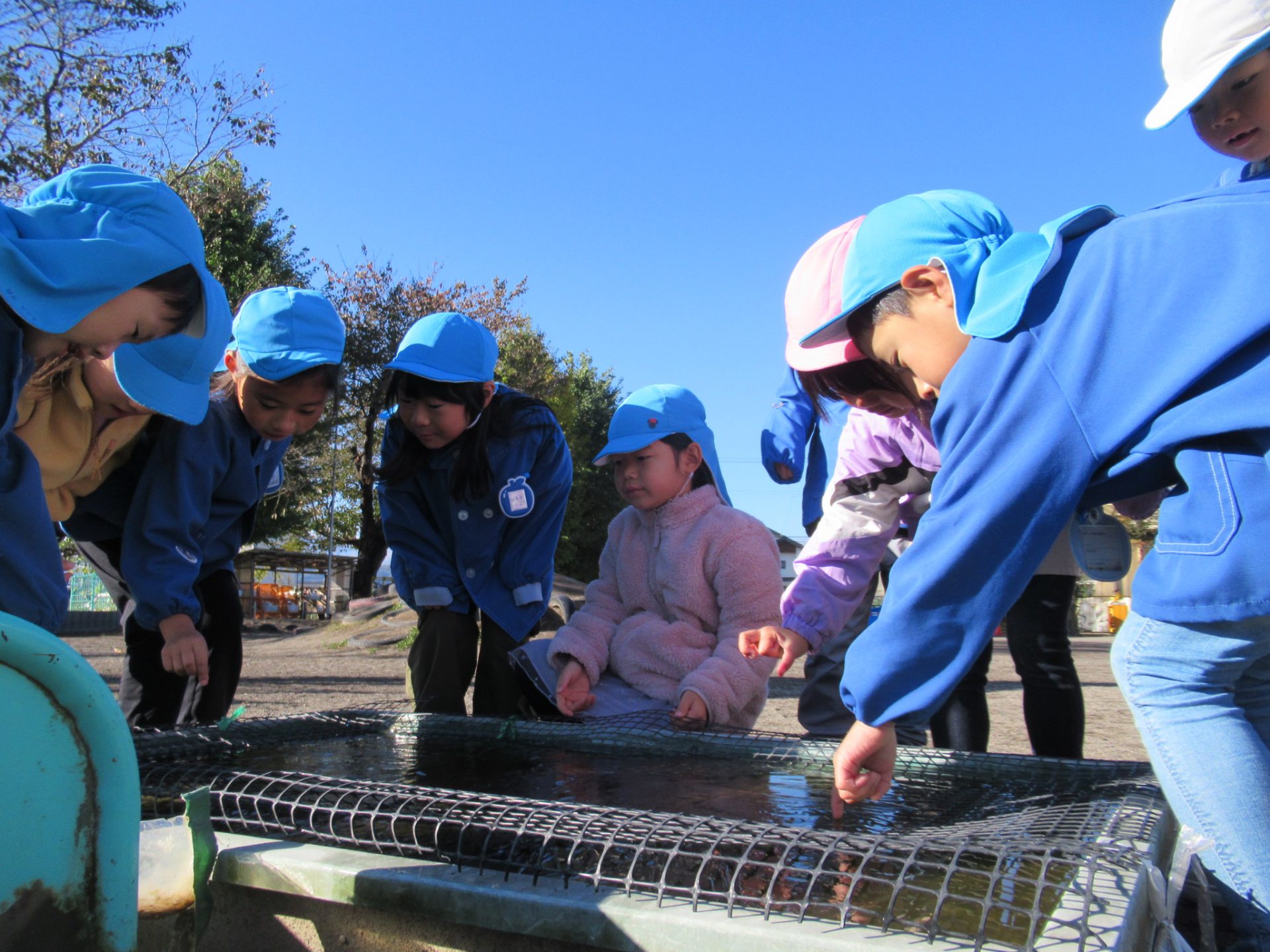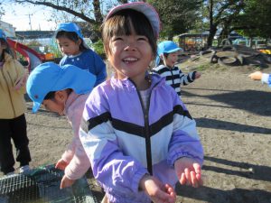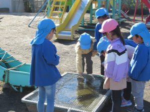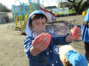 ・ビオトープには鮒が泳いでいます。「お魚さんも凍っちゃったのかな?」「死んじゃったかな…」と話していると「前に先生が言ってたよ!凍ったまま生きてるんだって!春になって氷が溶けたらまた泳げるようになるんだって!」「じゃあ3月になったらまた会えるかな?」聞いて知り得た知識を友達にも伝え、また会えるのを楽しみにしている姿が見られました。