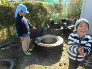 気温が下がったある日。「先生きてー!大変!」と園庭で大きな声で呼ぶ子ども達。様子を見に職員が行くと「タイヤが凍ってる!」とタイヤについた霜をみて驚いていました。