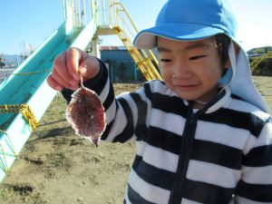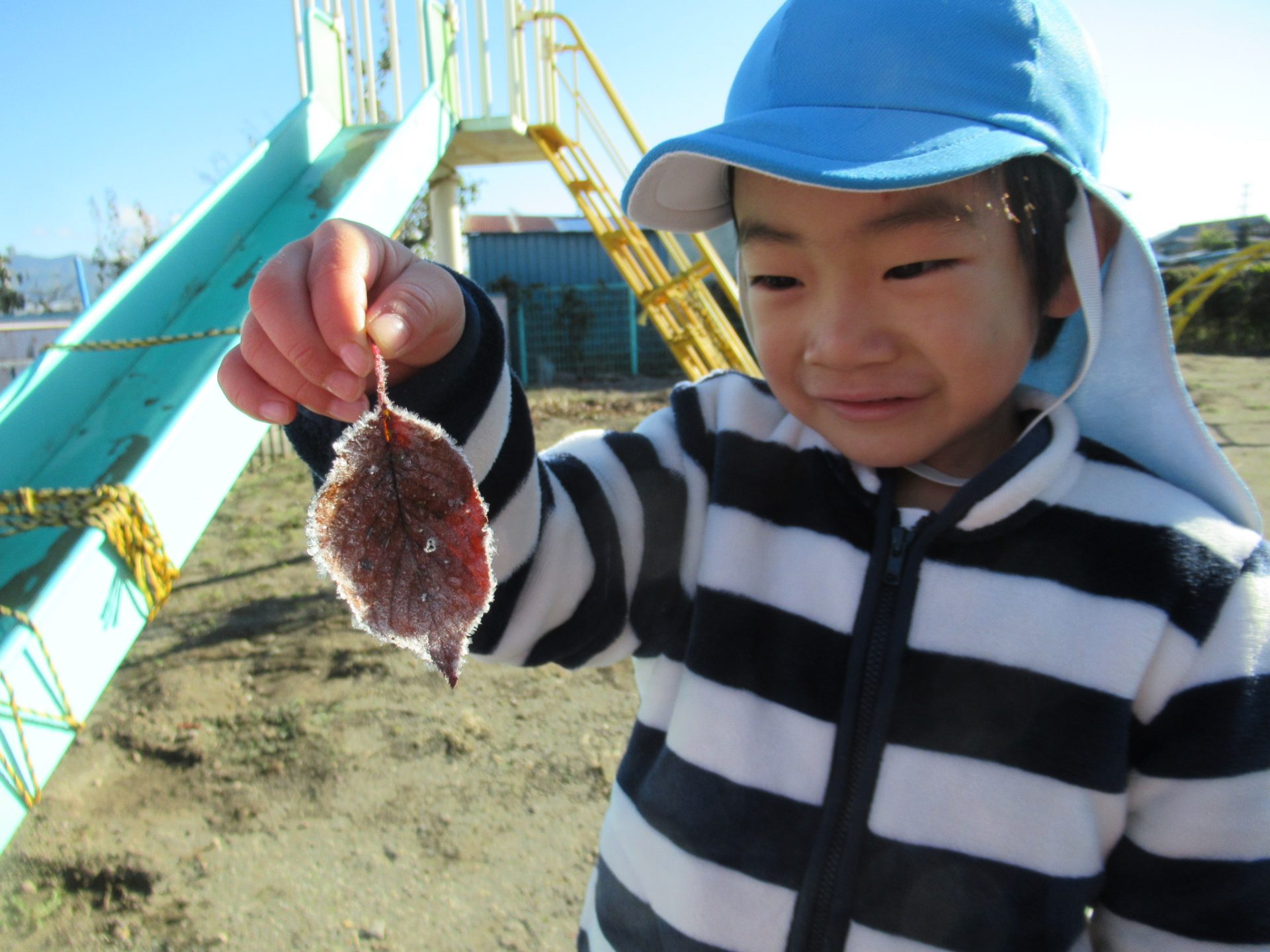 ・「みてみて!葉っぱも白い洋服着てる!」凍った葉っぱを見つけて霜を白い洋服と表現した子。しばらく日の光に当てるとキラキラ輝きだし「みて!魔法がかかったみたい!」と喜んでいました。