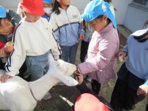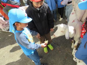 いざ!ヤギさんと触れ合い!2匹のヤギに初めは「キャー!」「怖い!」と逃げいていた子も多かったですが2年生に餌のあげ方を教えてもらい挑戦!