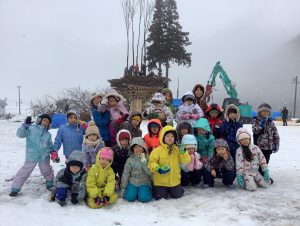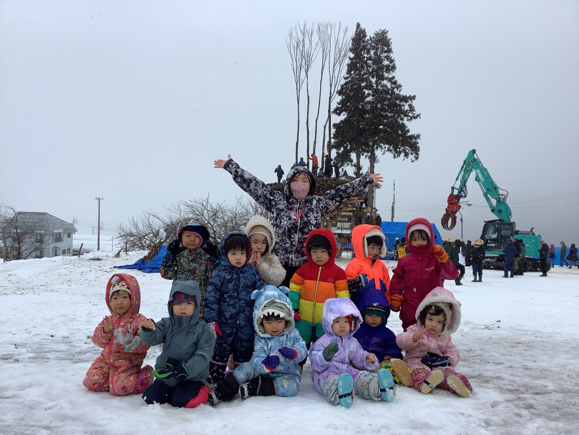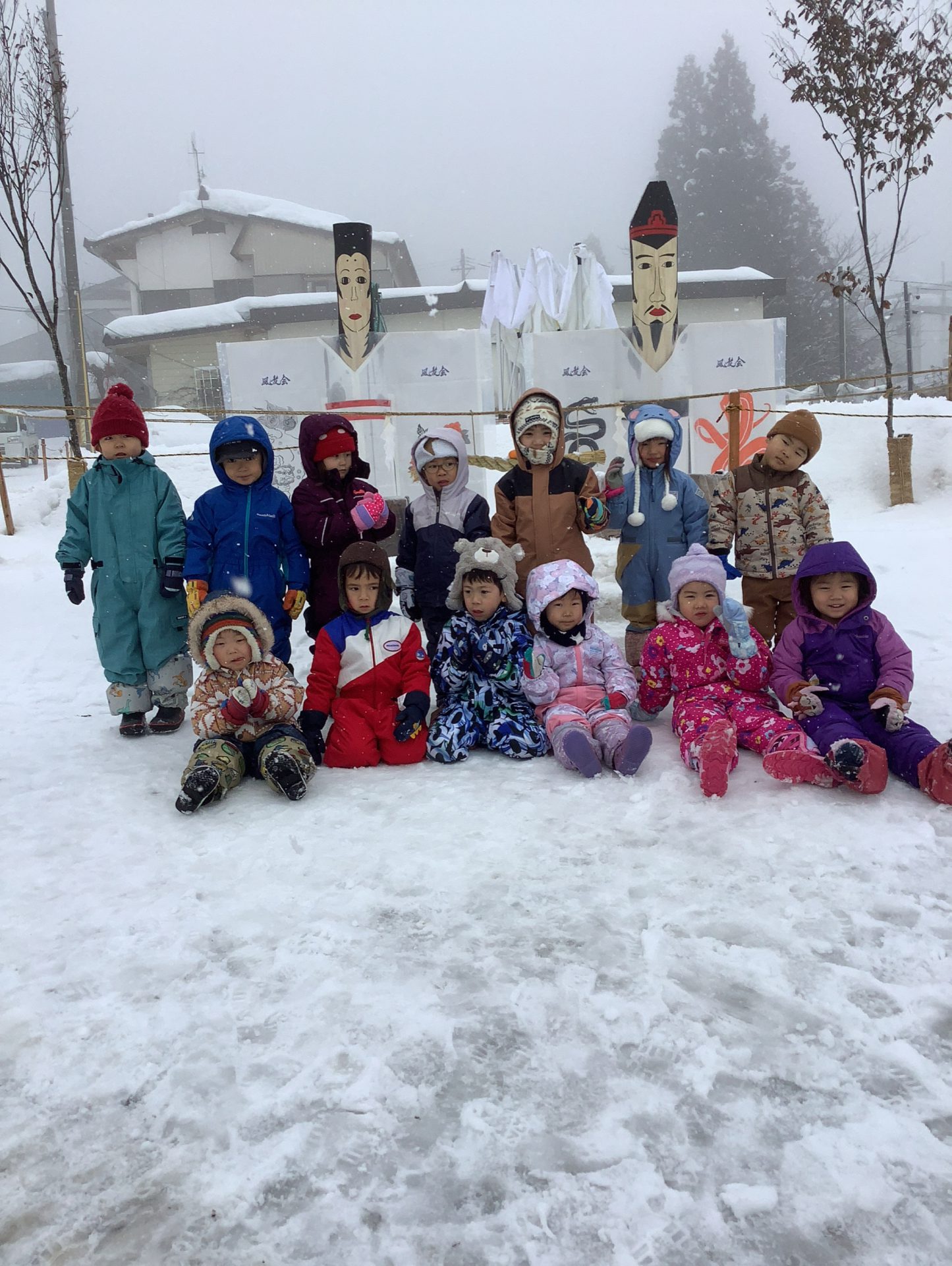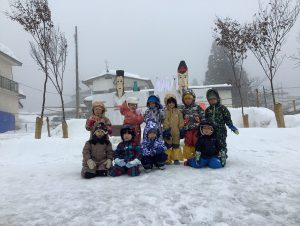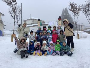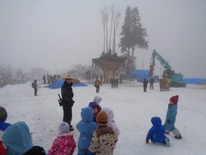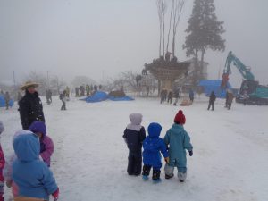 雪がチラチラと舞う中でしたが3、4歳児で道祖神祭りが行われる会場まで歩いて行きました。