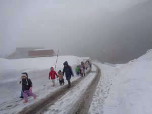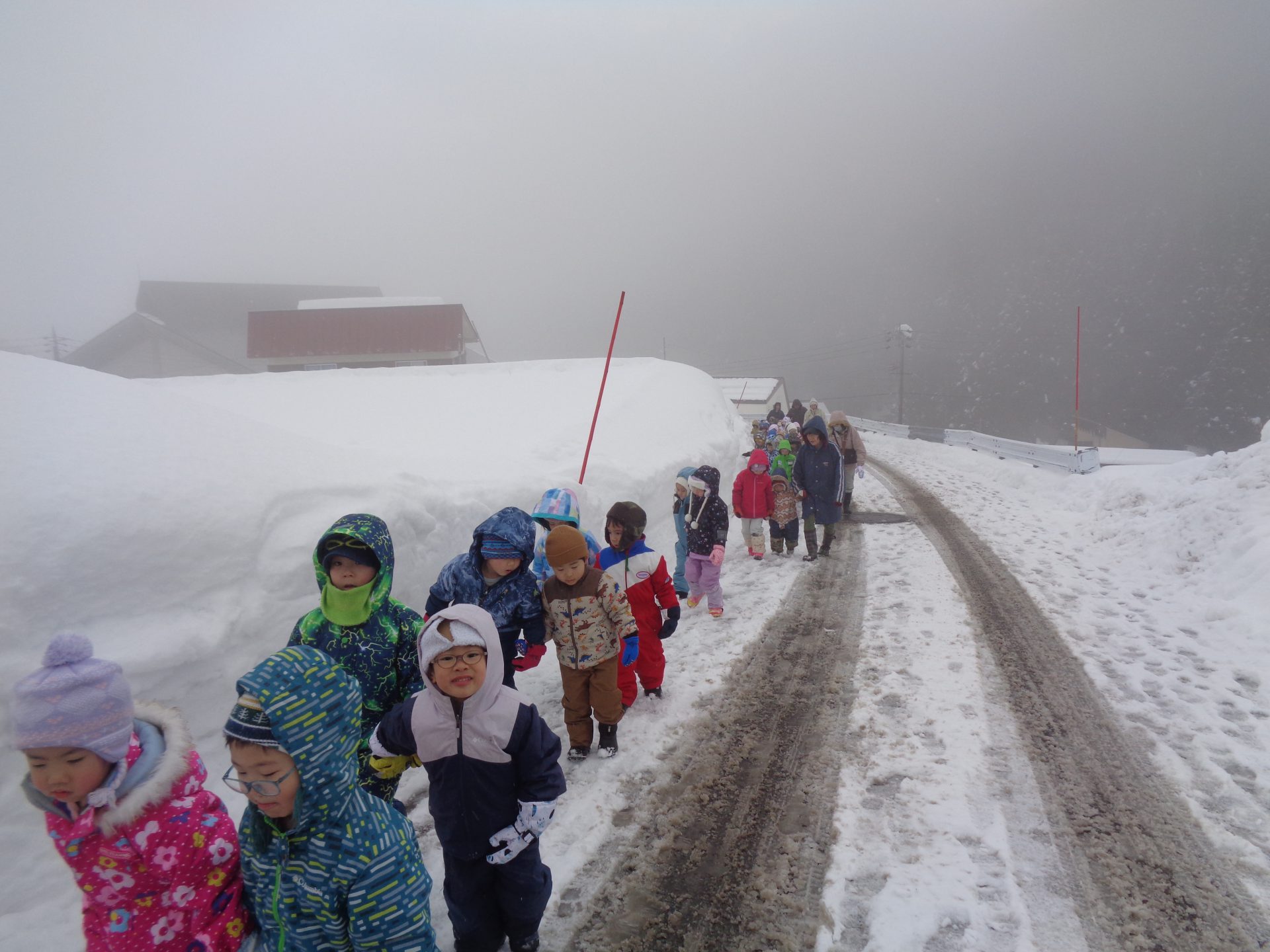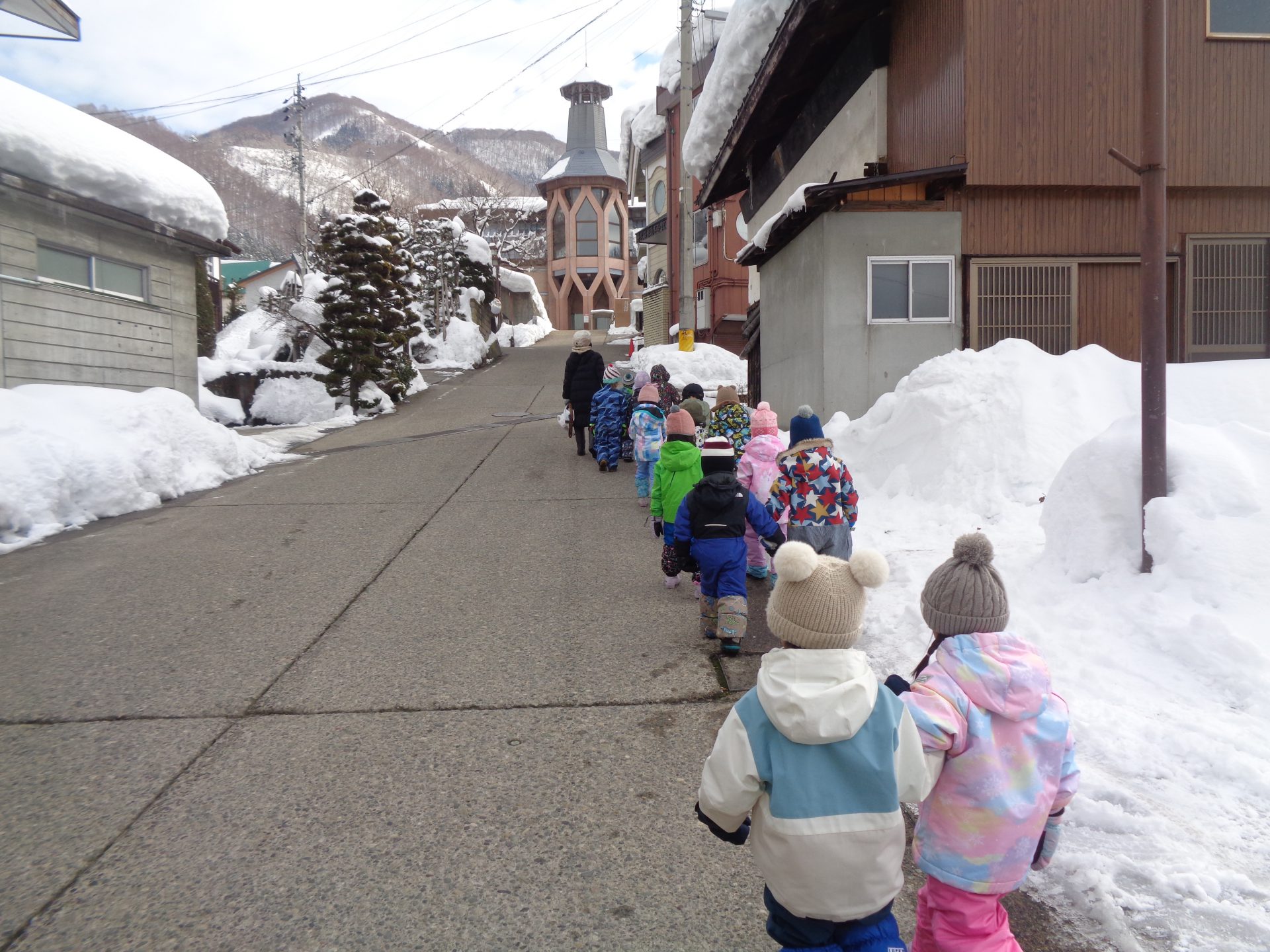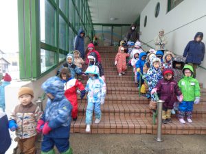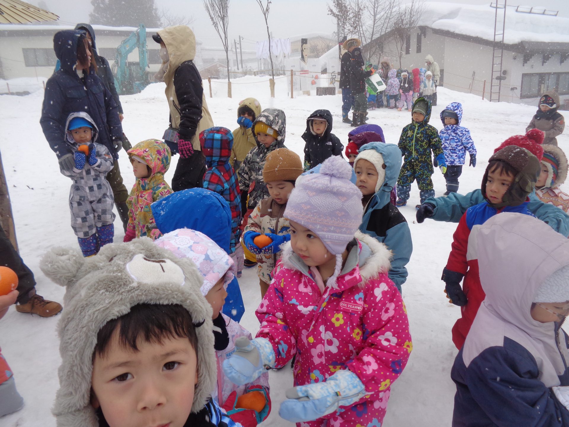 雪がチラチラと舞う中でしたが3、4歳児で道祖神祭りが行われる会場まで歩いて行きました。