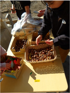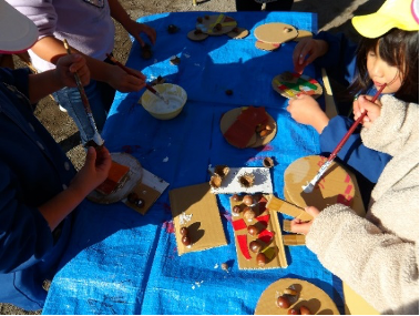 カッテ石やどんぐり山でたくさんとってきたどんぐりを使って、なかさとっこ広場にどんぐりの制作コーナーを作りました。