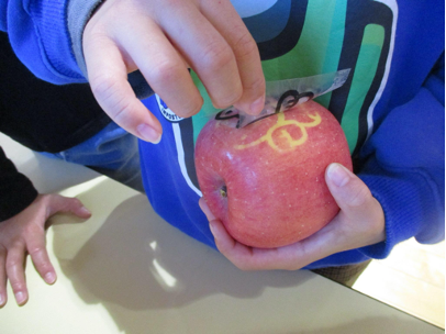 家庭でリンゴを育てている子どもが「おひさまが当たるところだけ赤くなるから絵になるんだよ」と教えてくれました。