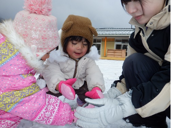 「○○先生雪玉作るの上手だったよ!手伝ってもらおう!」