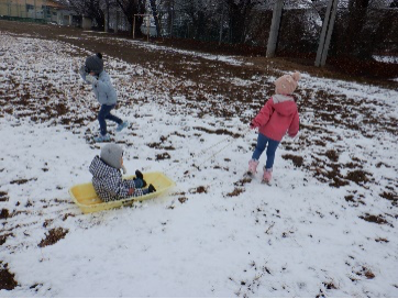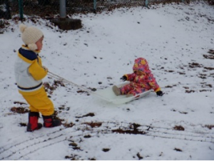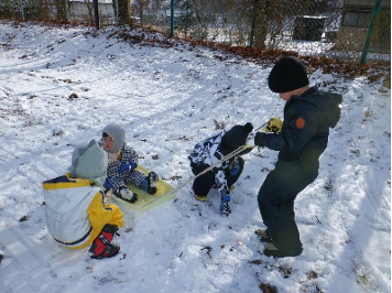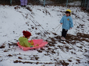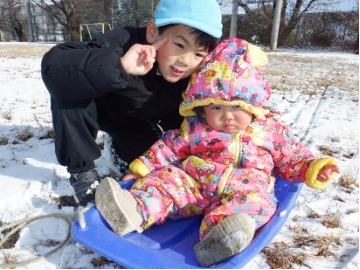 グラウンドで先に遊んでいた年長さんがソリを引っ張ってくれます。