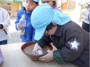 もみすりは、料理で使う“すり鉢”と“、なんと”野球ボールを使います。「これで皮がむけるの?」不思議そうな子どもたち・・・