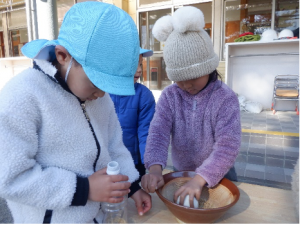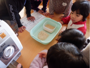 精米したお米は、園で育てた大根やサツマイモを使って豚汁会をするときに、一緒に炊いてもらうことにしました。