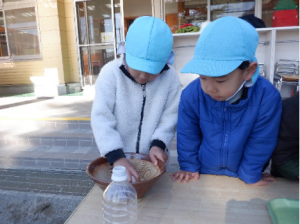 豚汁会の日、みんなのお米を自分たちで洗って、給食の先生に炊いてもらいました。