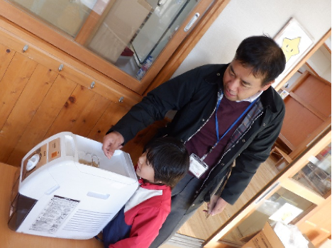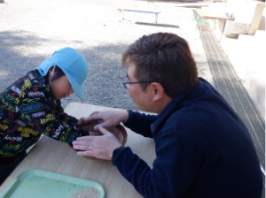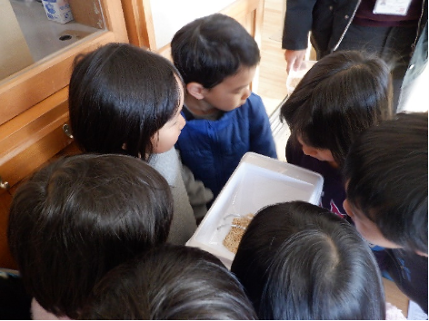 最後の工程、精米は機械を使わないと難しいため、市の子ども家庭支援課の方に来ていただき、一緒にやってもらいました。お米博士と一緒に来てくれていた方なので、もうとっても仲良し!「どうなるのかなあ」興味津々で、精米機をのぞき込む子どもたち。