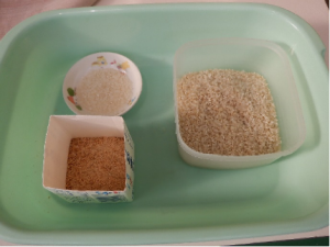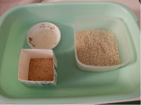 こども園のお米は、9分づき米(白米より少し茶色)にしてみました。左上が市販のお米、右側が、園で栽培~精米までしたお米です。左下は米ぬかです。