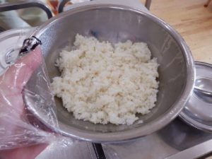 一口ずつですが、みんなの手元でラップを使っておにぎりにしました。においはどうだろう、味はどうかな。