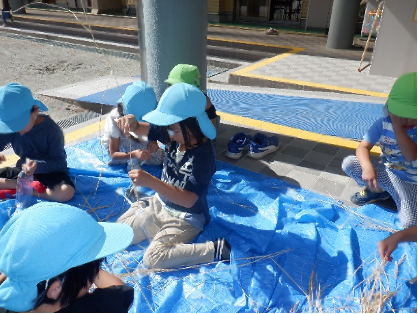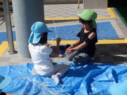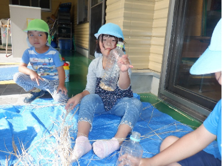 「何やってるの?」脱穀の様子が気になって、見に来た年中さん(右側)。ペットボトルを押さえてあげて、お手伝いで参戦します。