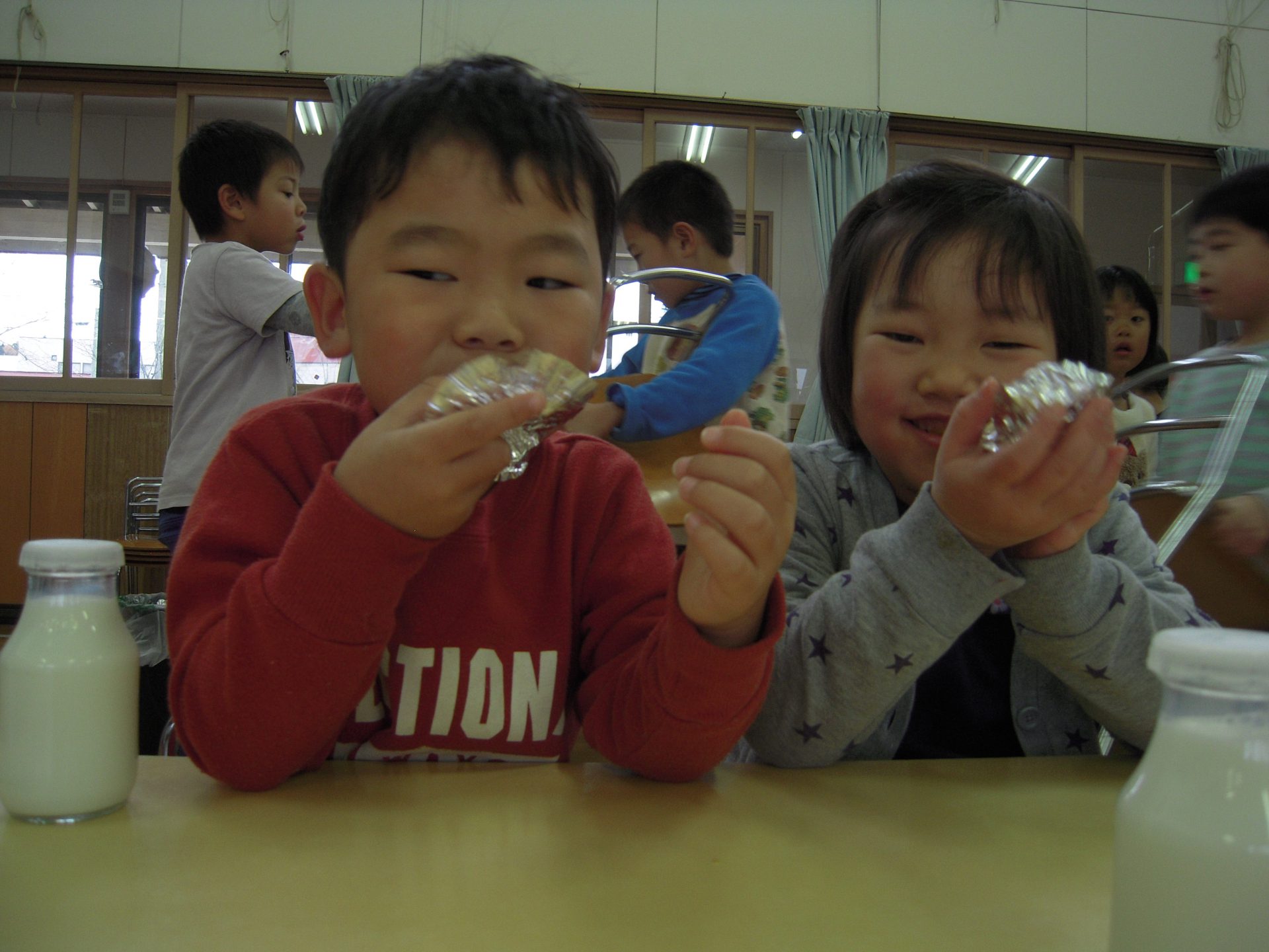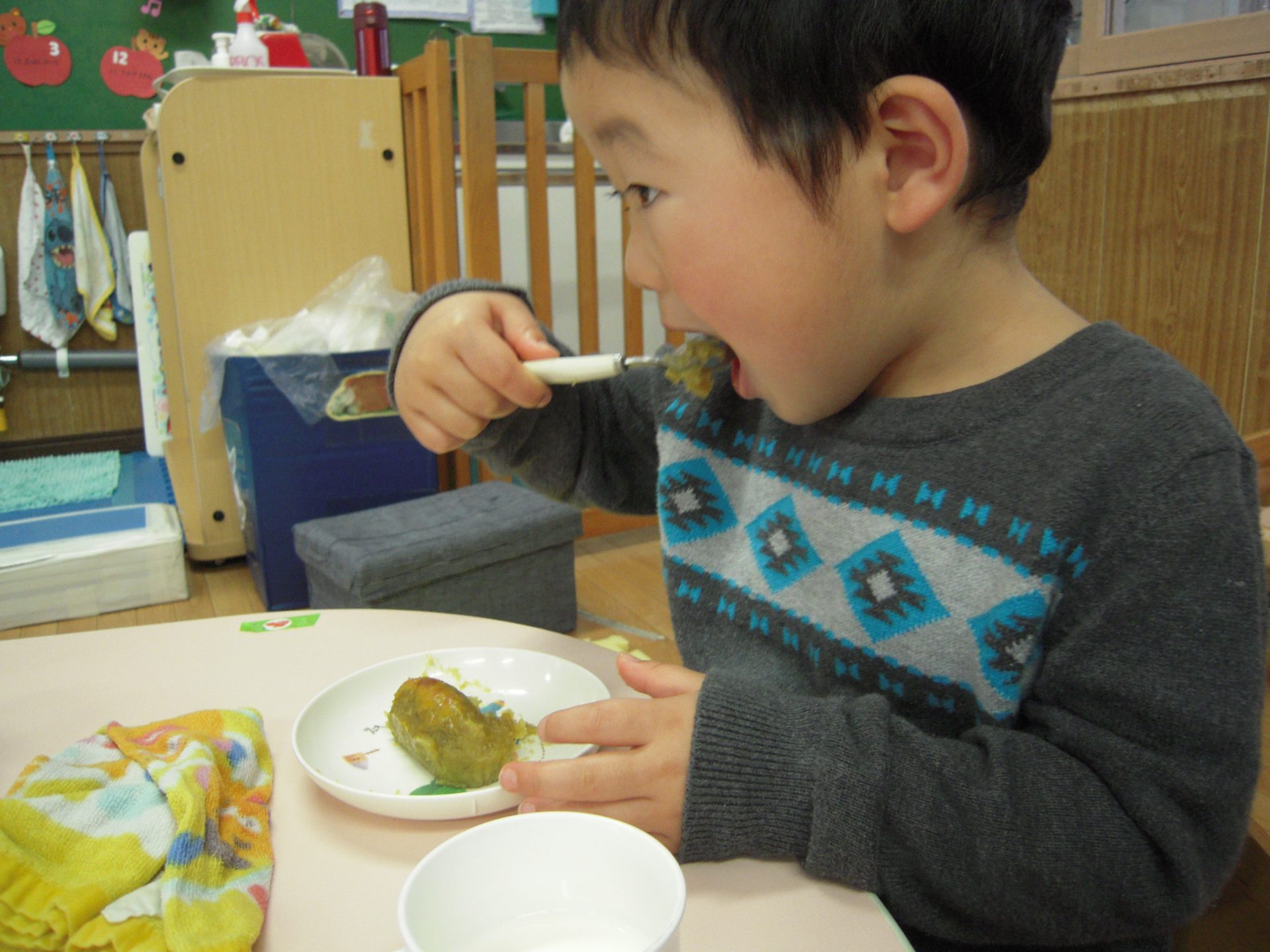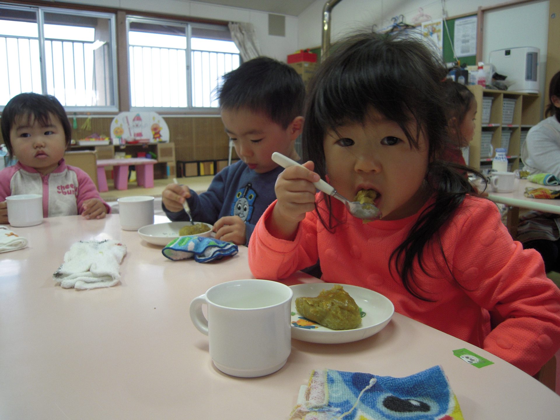 初めて食べる子も多い様子の未満児さん。ひと口食べてみるとおいしかったようで、パクパクと食べ進めていました。